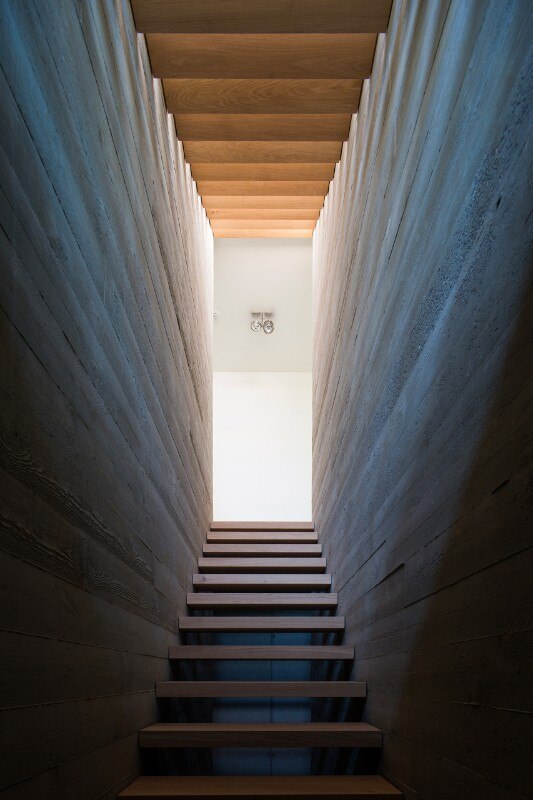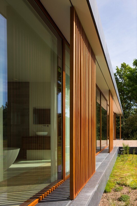 The construction of the house is 80% concrete moulded on site. The walls of the sous-terrain and the vertical walls at both sides of the staircase are exposed concrete. To have the best possible result of concrete moulding for the nine meters high bearing walls, a horizontal wooden mould was made on site. The walls were moulded horizontally and later, with the use of two cranes, placed in the centre of the house. Wooden Brise-soleils that can slide along the entire perimeter of the house in between the cantilevered roof and floor provide shade were needed most and provide privacy to the open bath room and bedroom.