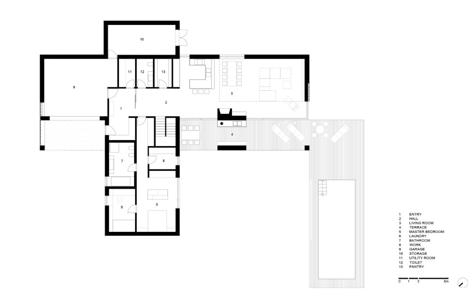 The main living space is in the South-West end of the double-height volume, which also includes an open gallery to the upper level. The living style is informal, with the kitchen-dining also oriented to the roofed, outdoor kitchen and entertaining area. The wood timber construction, is made from massive wood beams and panel walls, which ultimately form the ‘wood-living’ concept of the house. The wood panel wall system is left exposed to view, with a light white-toned stain, elegantly contrasting the dark wood floor and wall cladding.