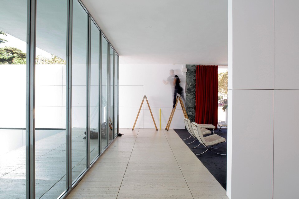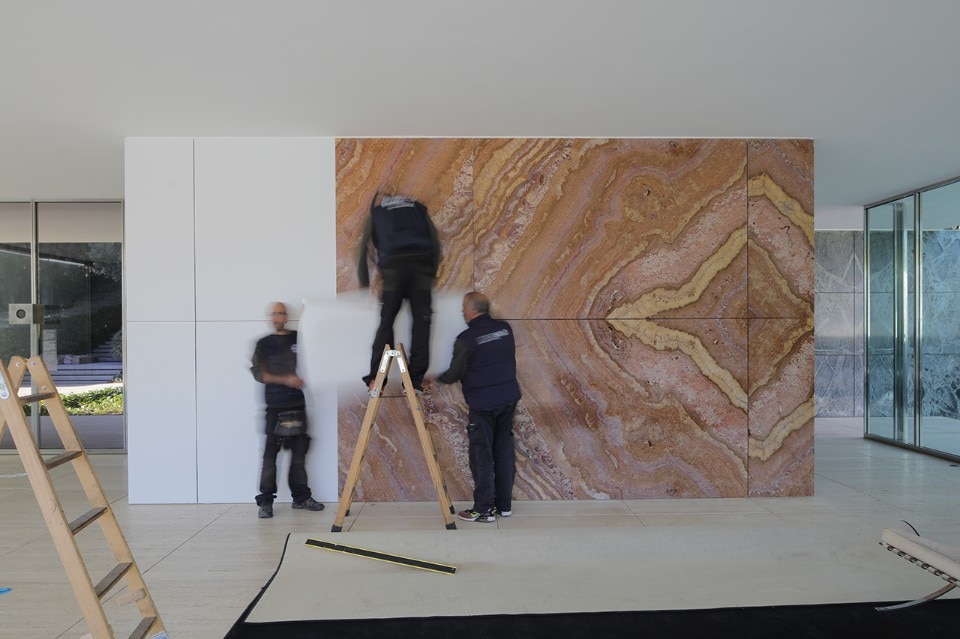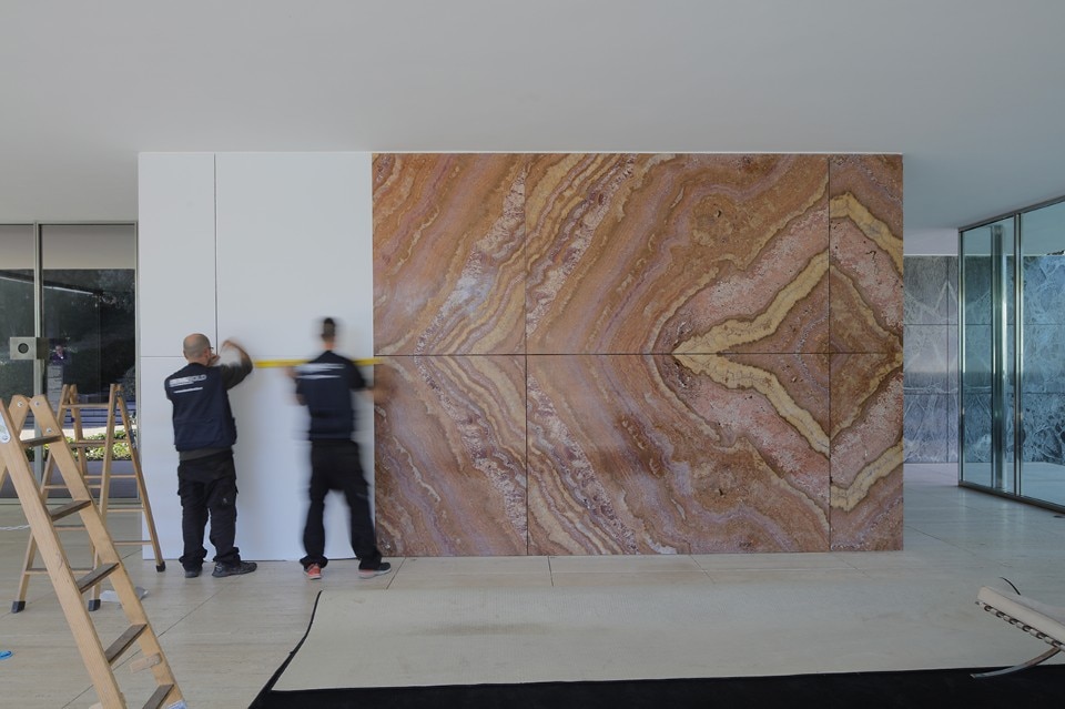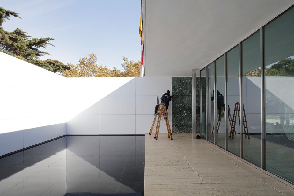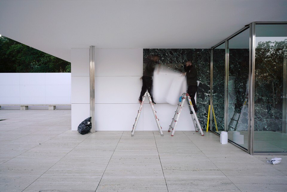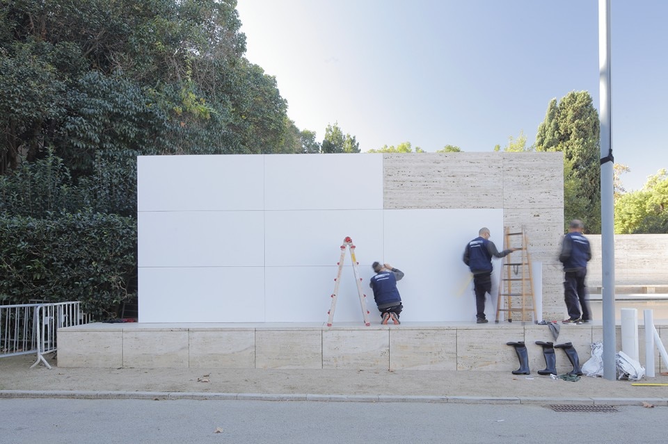 Seven days ago we published “Mies Missing materiality”, the temporary installation designed by Anna and Eugeni Bach, where the original surfaces in travertine Tinos marble, Vert antique marble and golden onyx of the Mies Pavillon in Barcellona have been covered with white vinyl panels.