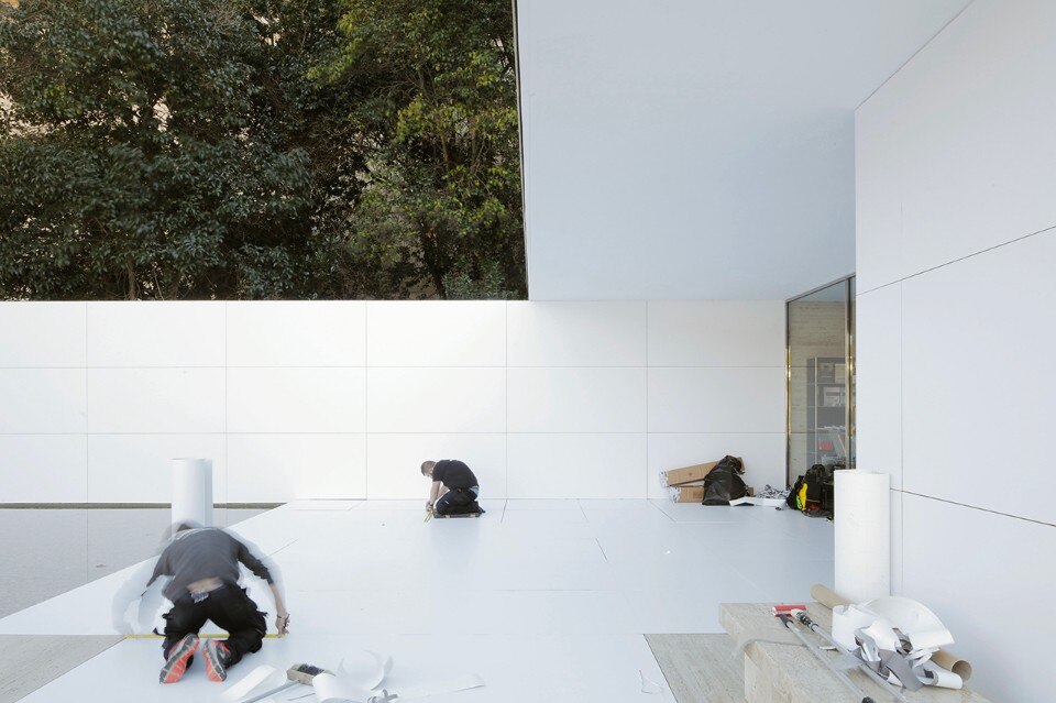 We have been discussing if the operation is about dressing or undressing. The conclusion is: neither. The materiality is more like overrode, allowing to observe the space in other terms. This is specially interesting, and somewhat disturbing, in this architectural masterpiece very strongly based on materiality but with plenty of other values and possible observations.