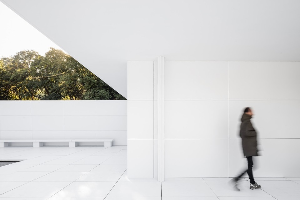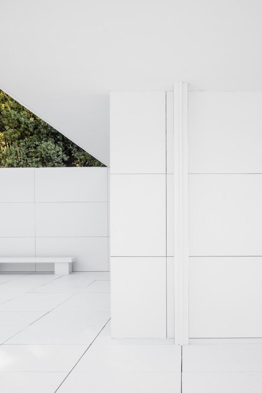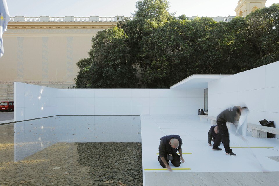 Whiteness has a unifying effect on the different surfaces of the Mies’ pavilion and therefore the different parts (walls, pavement, ceiling, pillars...) lose their hierarchy. The role of white is not only the representation of this loss of materiality, but also the emblem of the first epoch of the modern movement. This contradiction between white as the historiographical image of the modern movement and the role of the Barcelona Pavilion as one of the icons of this very same modernity is something that the installation wants to underline.