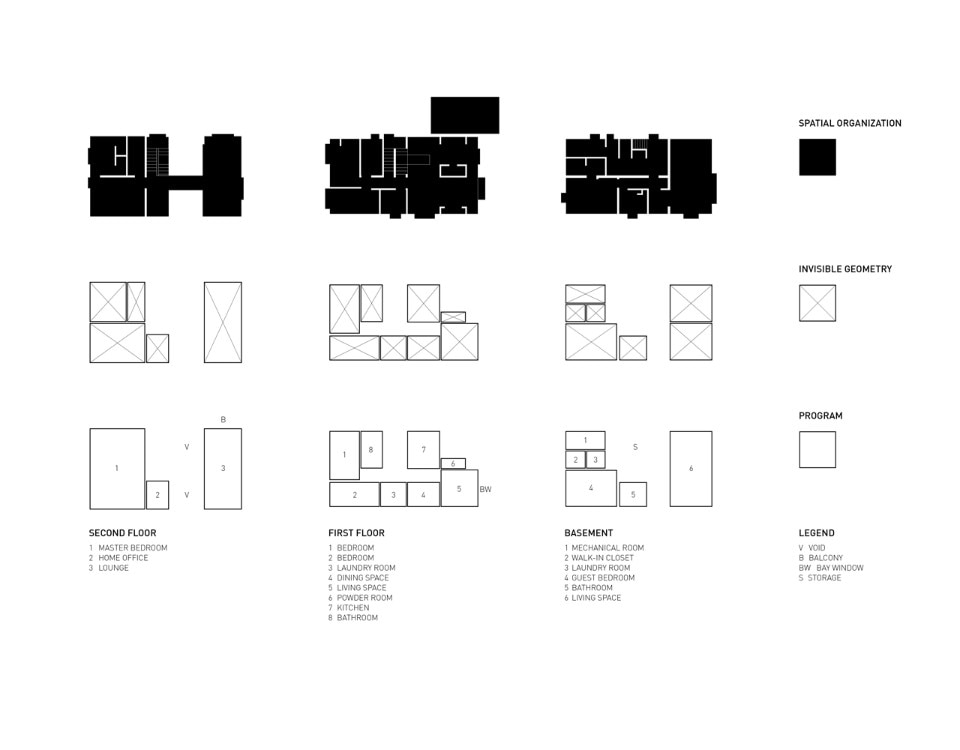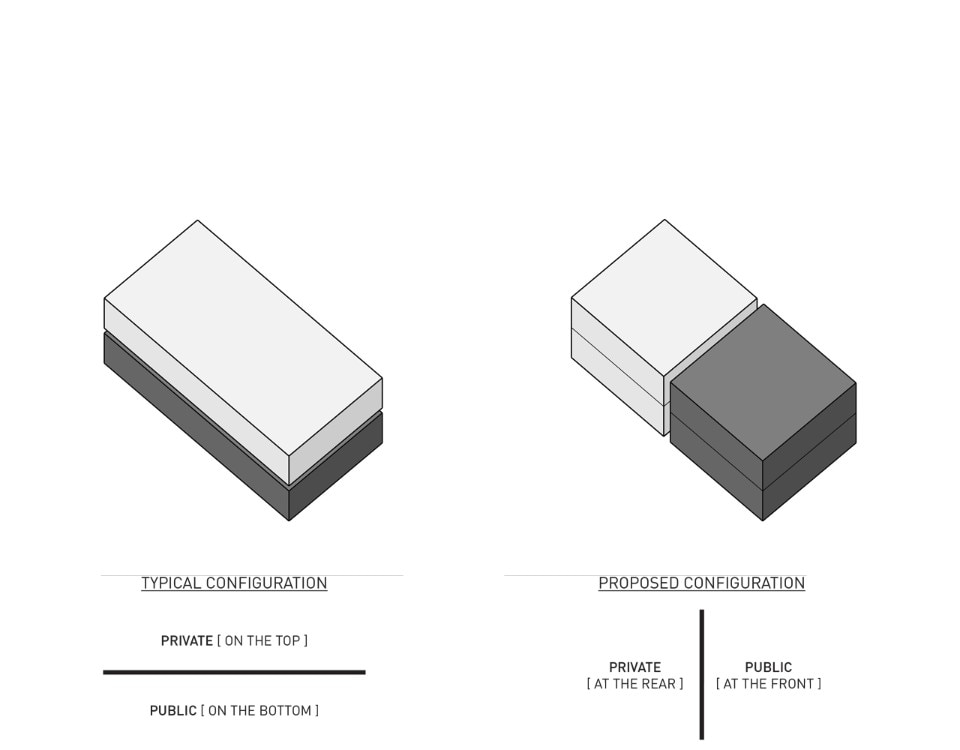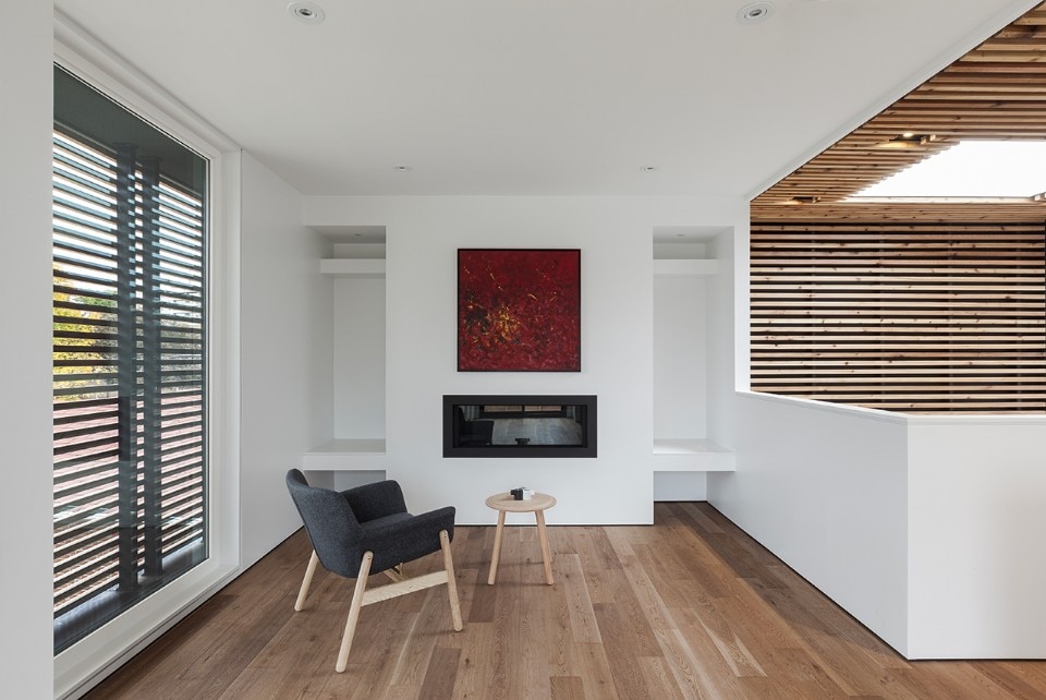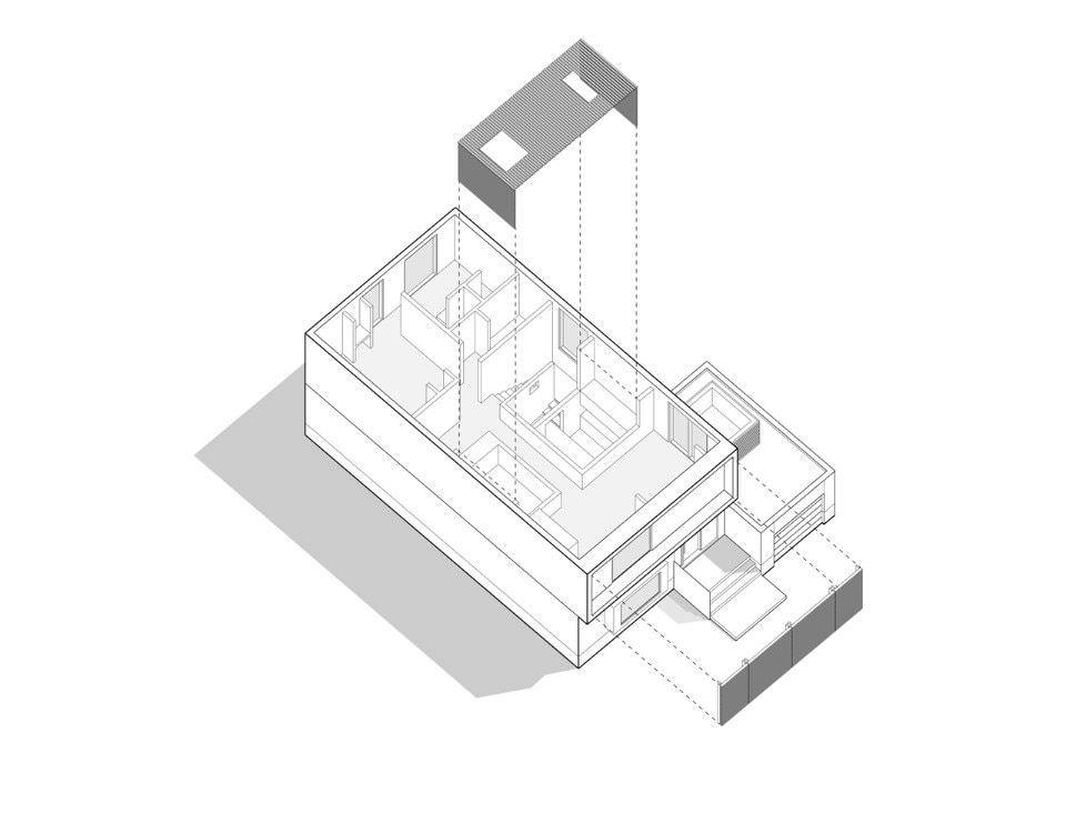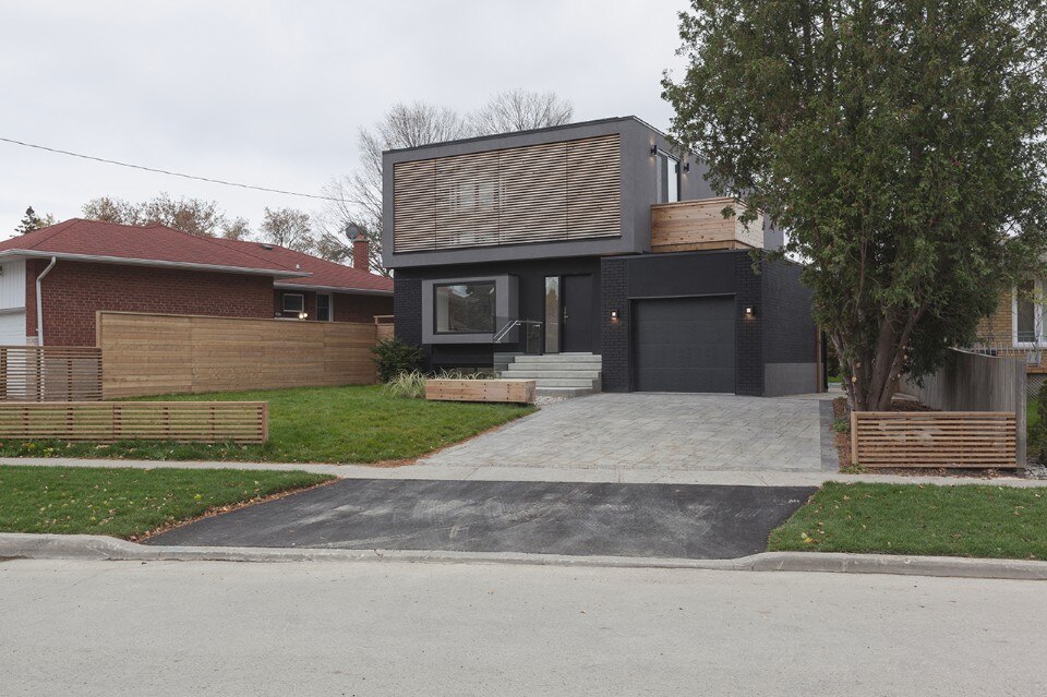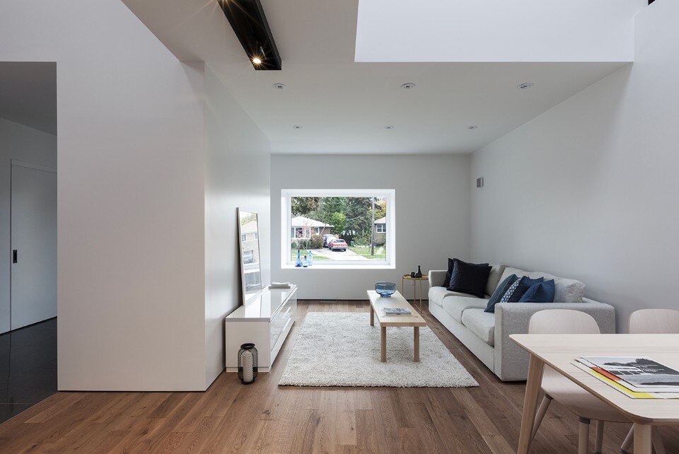 Designed by Atelier Reza Aliabadi, the Flipped House is a renovation project and second-storey addition to an existing brick bungalow in a residential neighbourhood in Eglinton East on the border between Toronto and Scarborough. Flipped House adopts a configuration that divides its public and private zones on either side of a vertical plane. As a result, the home’s den, kitchen, dining, and living rooms are all located on its street-facing northeast side, while the house’s three bedrooms span both levels of the building’s more secluded southwestern end.