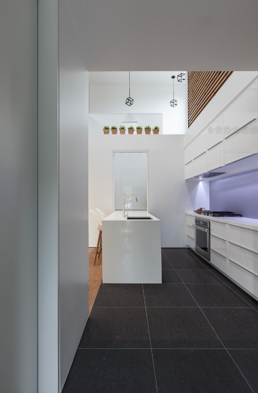 The home’s varying ceiling heights work to communicate this symbolic dividing line. The linked first-floor kitchen and dining room are double-height spaces, with the ceiling then dropping down to single-storey height as one enters the hallway moving towards the residence’s more intimate back bedrooms. A slatted screen on the second storey is installed to distort the scale of the property and ensure that the structure reads more like a monolithic object than a typical home.