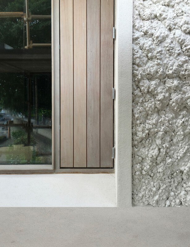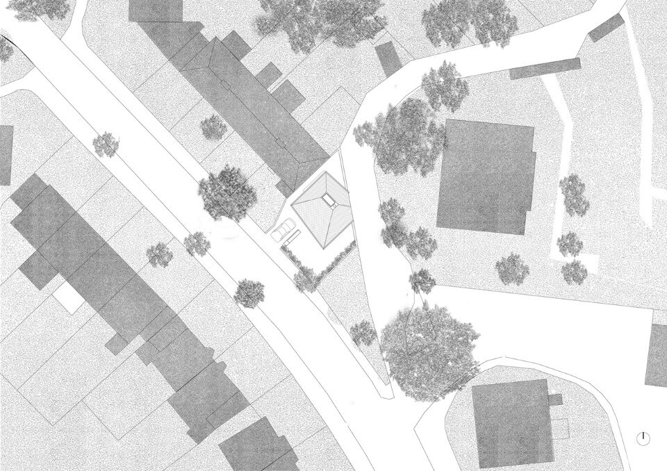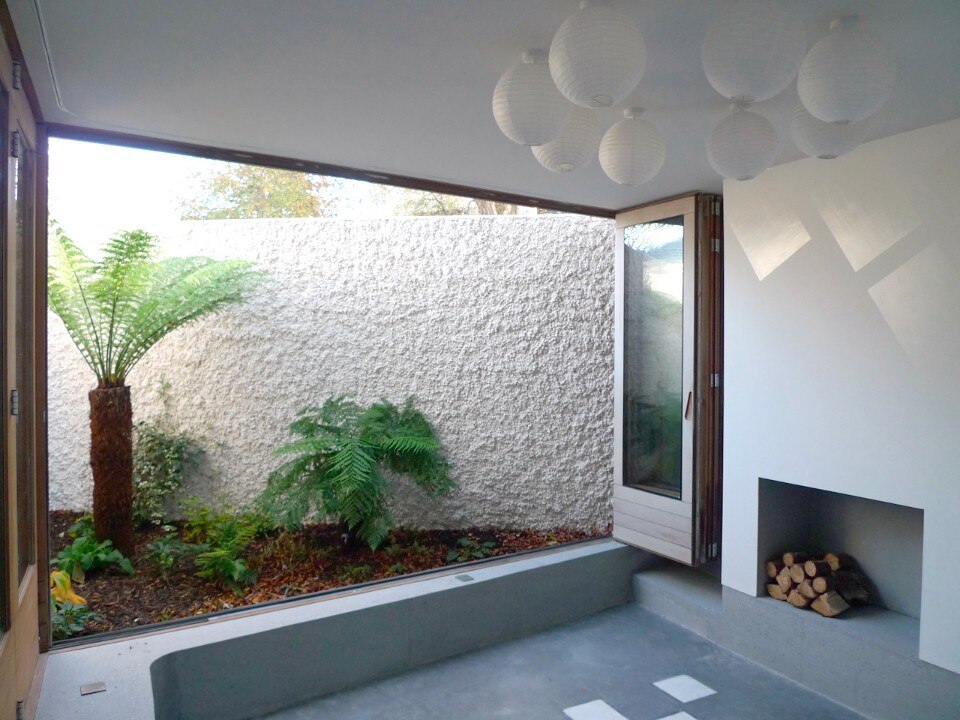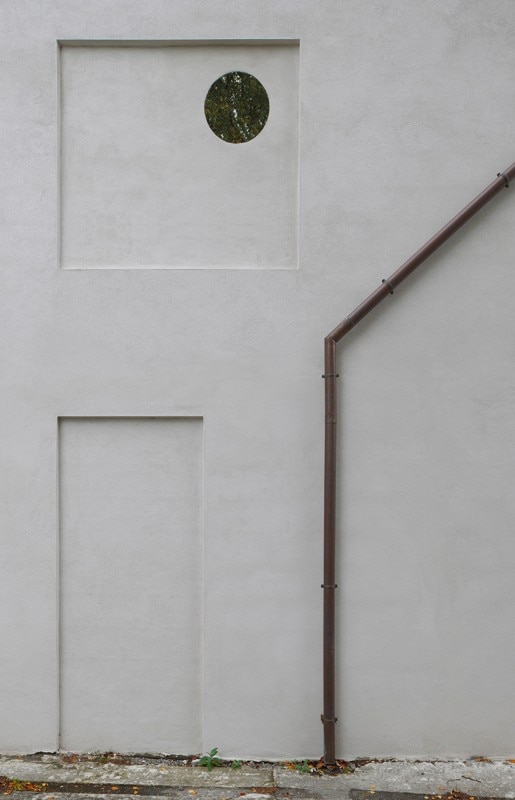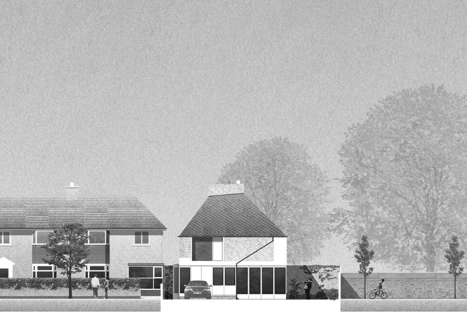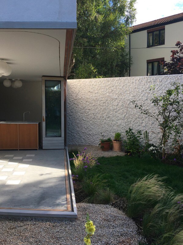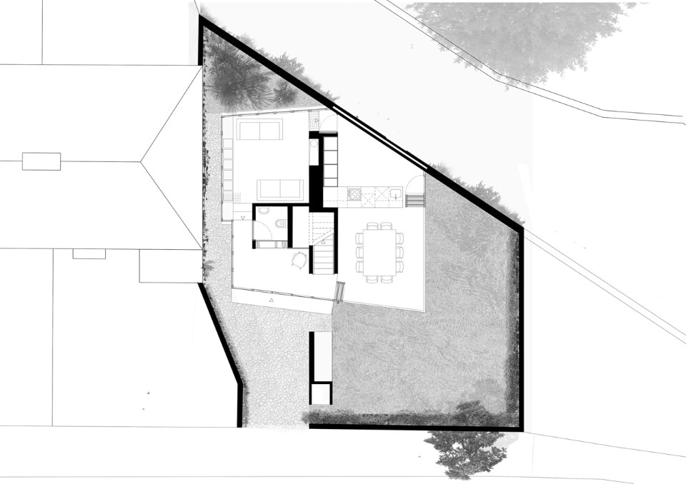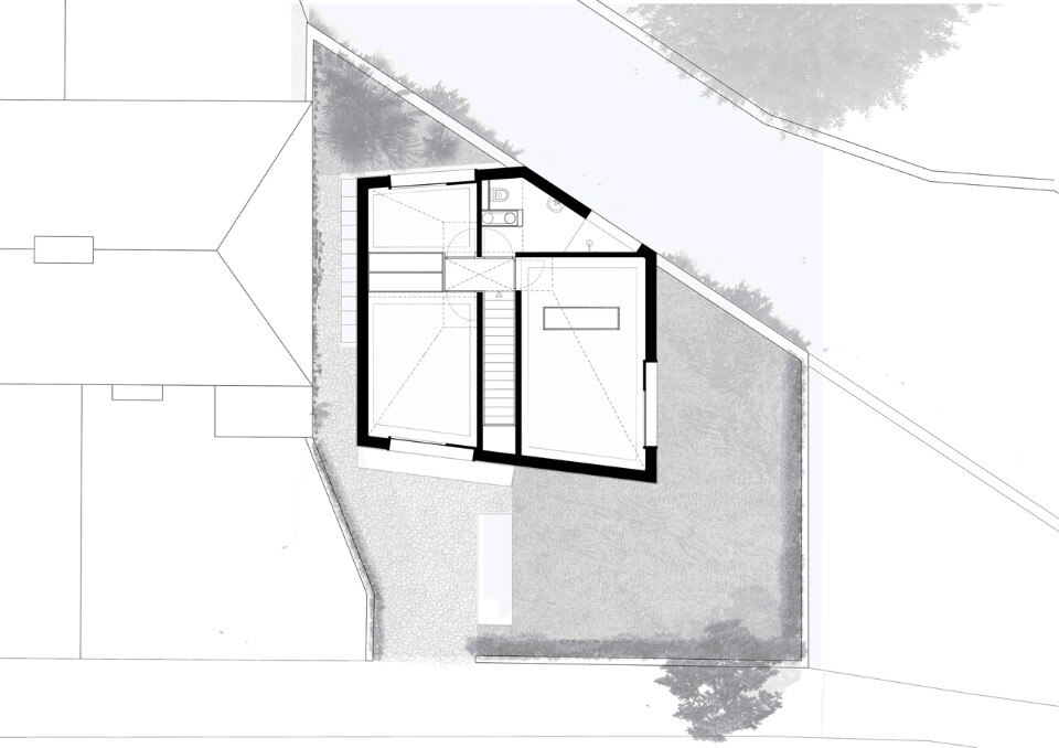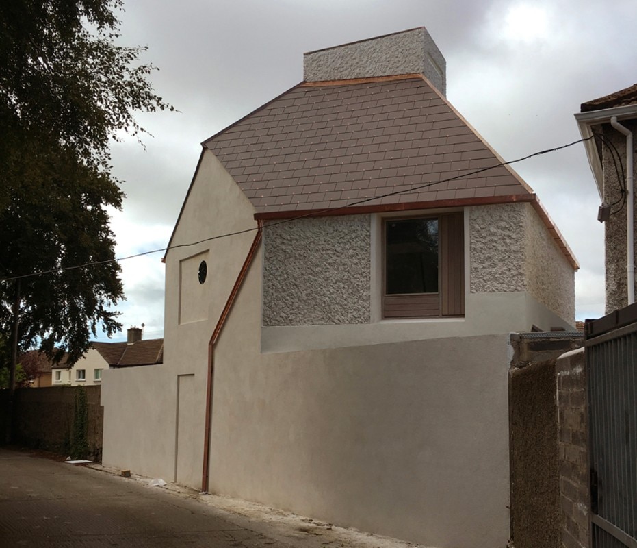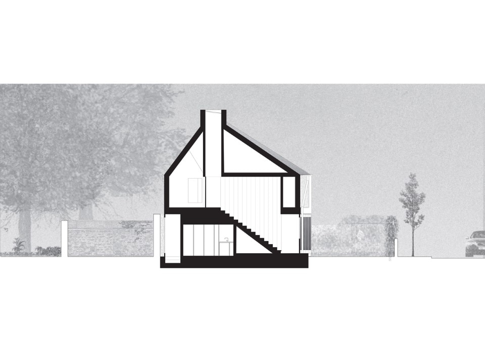 The first floor is laid out with three bedrooms and a bathroom off a small central landing. The landing is lit from a tall roof light contained within an extruded chimneystack and lined in timber paneling up to door height. Externally, the house is treated in a manner similar but exaggerated to the immediate housing. The masonry walls are finished in a pigmented off-white cementious render, deeply roughcast on the garden side and hand troweled smooth on the laneway elevation and public faces. A fibre cement roof is elaborated with expressed untreated copper crampions, copper guttering and tall standing seam hips. Copper downpipes are used to draw figures across blank parts of the facade reminiscent of line drawings. Over time these elements will oxidise to a pale powder green.