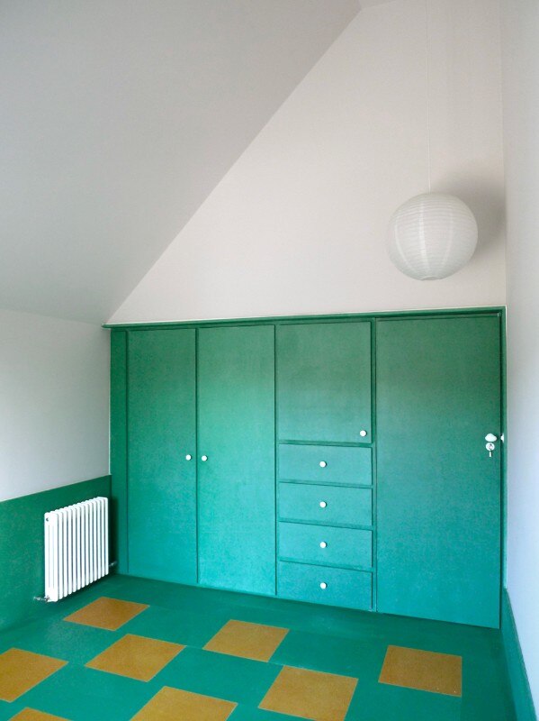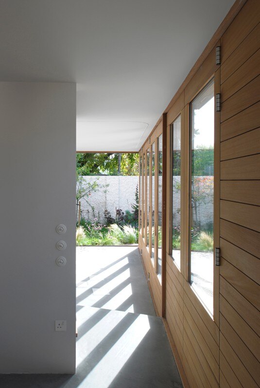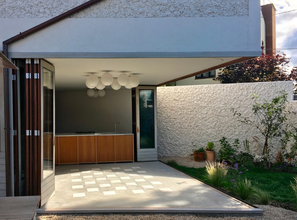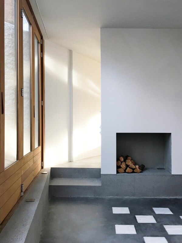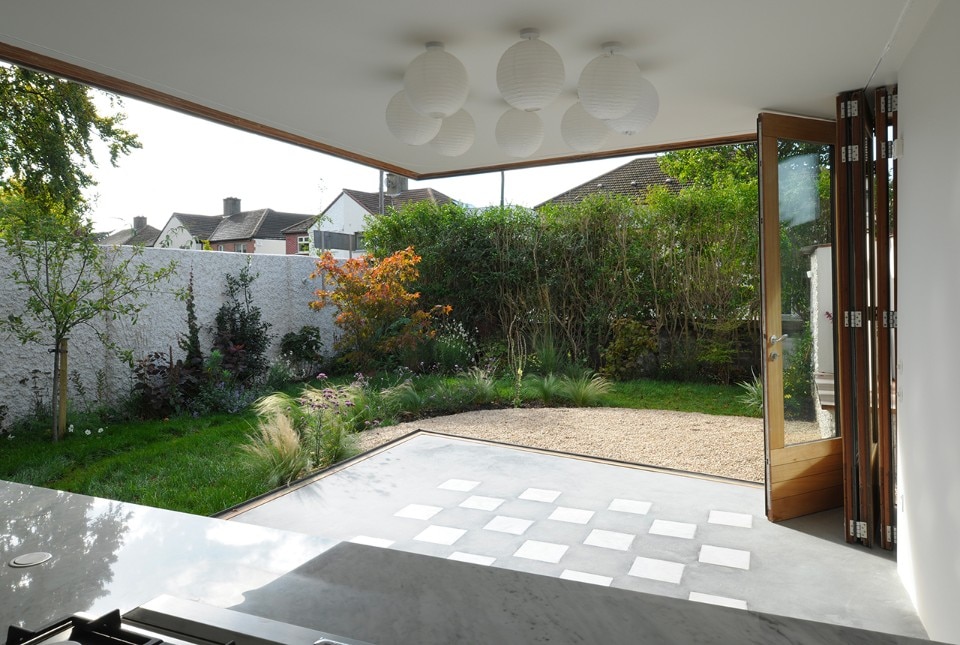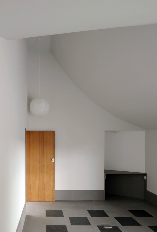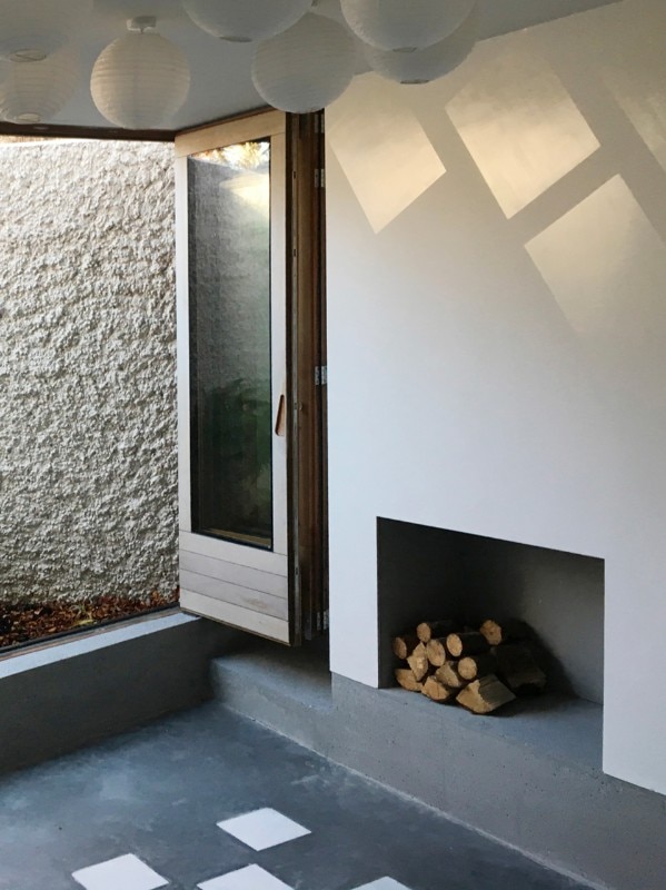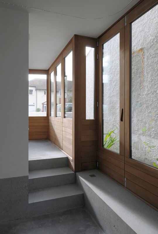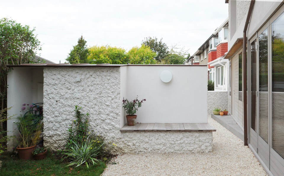 Designed by David-Leech Architects, this house is situated in a garden at the end of a short terrace of a 1940’s estate on the fringe of Dublin city centre. The ground floor layout is derived from the planning requirements for outdoor amenity space. To maximise the presence of the garden it takes advantage of the excellent privacy provided by the thick hedgerow. On the ground floor a cross-shaped core divides the plan into 4 public rooms: a hall, kitchen, dining and living room. These are located according to proportion and orientation and step in section to accommodate ceiling heights of varying dimension and intimacy. The core contains the service and plumbed elements of the plant, wash closet, kitchen, fireplace as well as storage and the staircase. A continuous loop of circulation is along the perimeter.