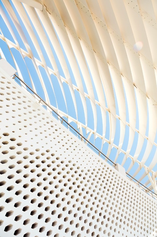 On street level, the new market enhances the public setting by forming a dynamically shaded canopy, organizing the spaces beneath it. The canopy’s form is derived from the sinuous flow of Arabic calligraphy. It follows the logic of a playful movement of light and shadow built from aluminium fins which provide shade, natural ventilation, and an ephemeral appearance. The complexity of the canopy roof contrasts the simple solidity of the concrete structure below it. When entering the fish market, visitors are immerged in a lively marketplace which offers more than 100 fish sellers and cutters, as well as a new market for vegetables and fruit. The new facility also offers refrigeration, packaging, and storage spaces alongside offices, coffee shops, and a rooftop restaurant.