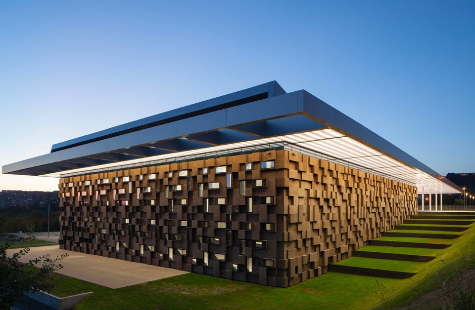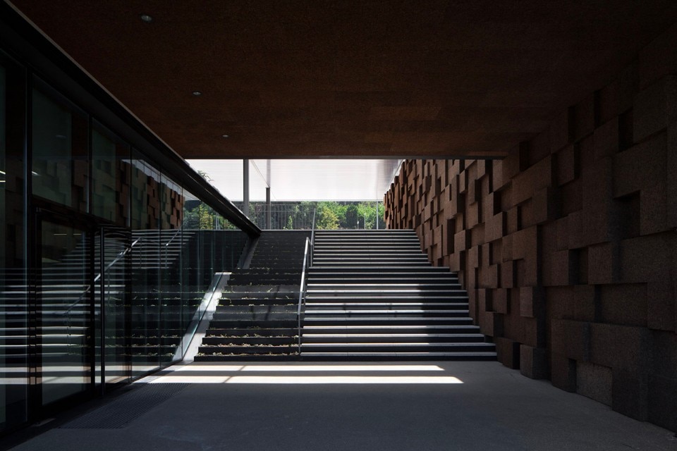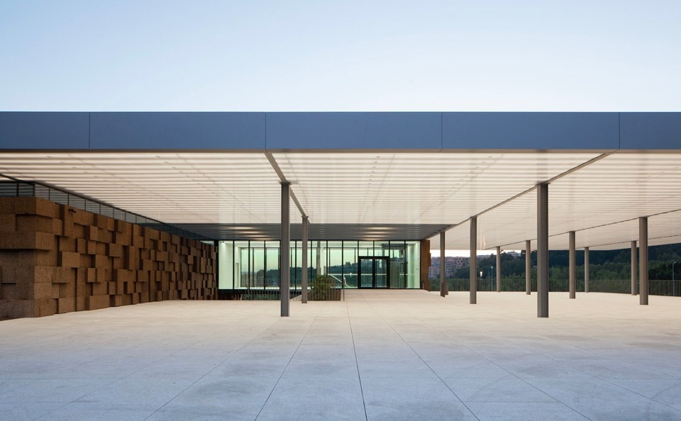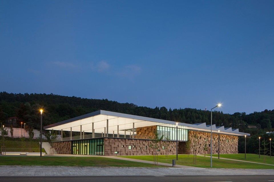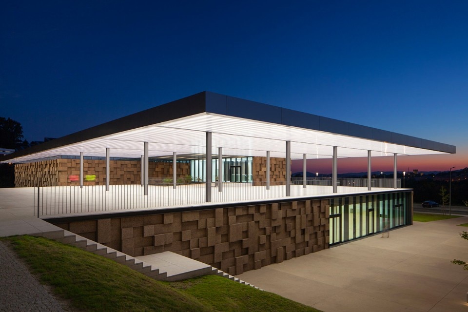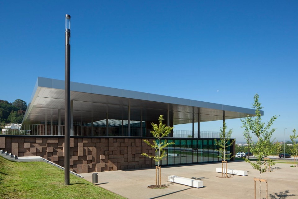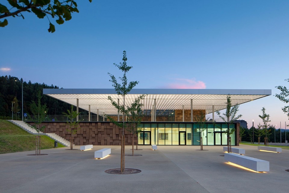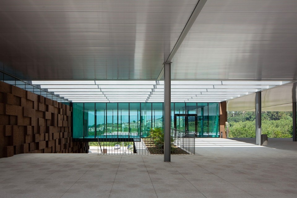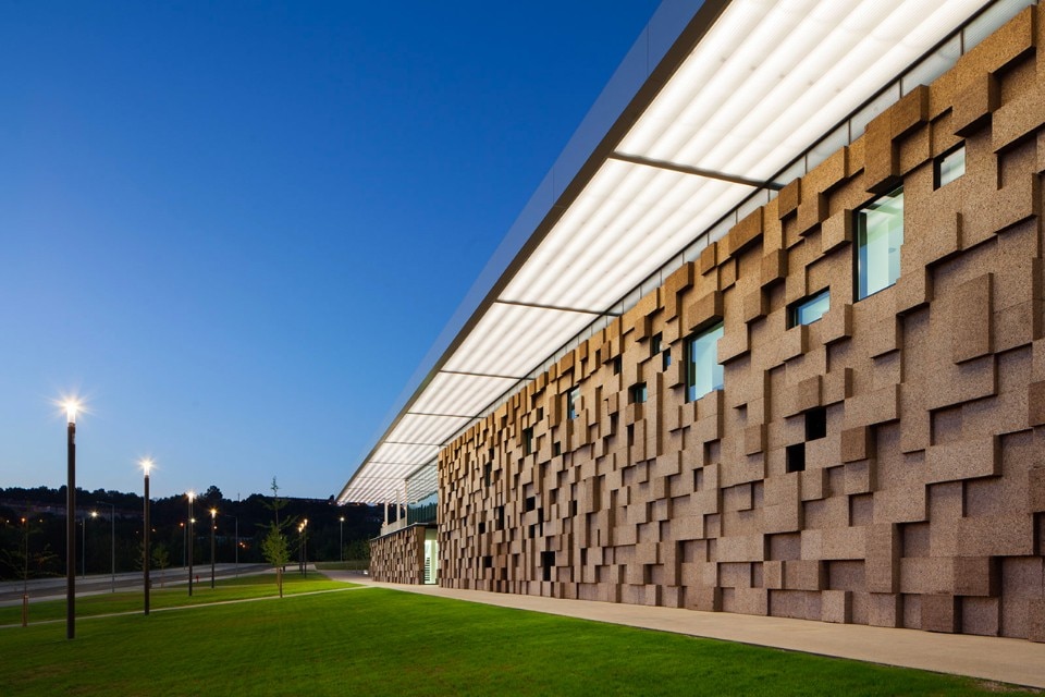 The choice of materials for the building reveals a pedagogic intent and shows environmental concern in the building design, serving the energetic efficiency and searching for a clear balance between technology and architecture. The facade, built from dark agglomerate cork, is a perfect example of that versatility, intending to represent a strong design trait for the project while keeping the association with the environmental sustainability. The building searches for scale and references on the surroundings, using its volumetric presence to create another element for the park walking paths, like the entrance plaza, that not only connects the two levels of the building but also allows the contemplation of the park and the eastern hillside of the city.