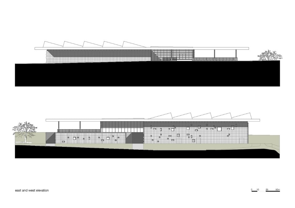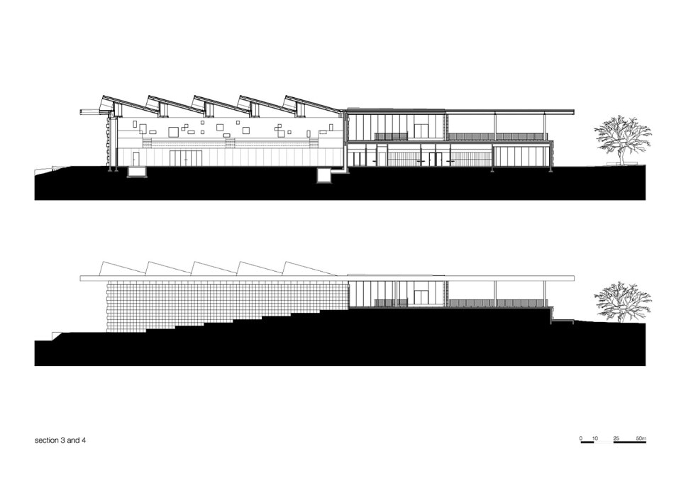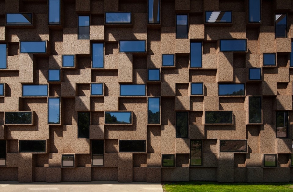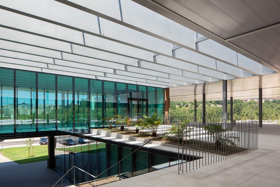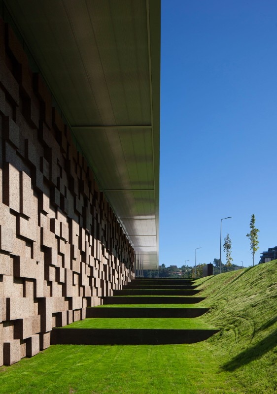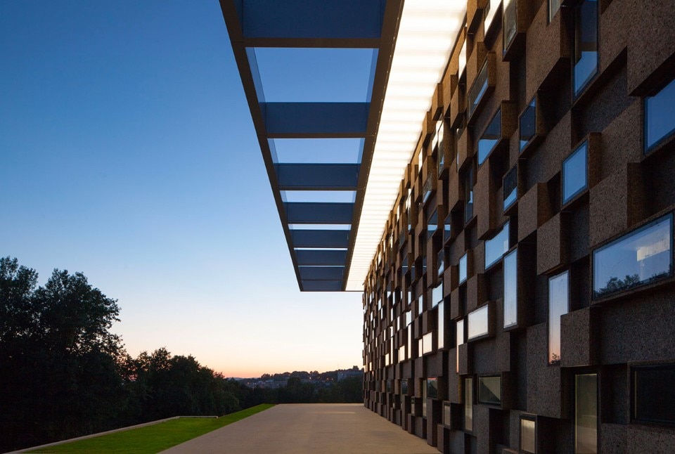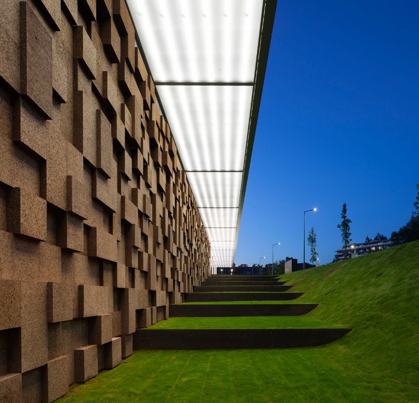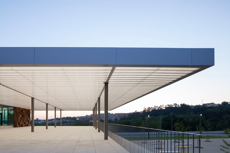 The choice of materials for the building reveals a pedagogic intent and shows environmental concern in the building design, serving the energetic efficiency and searching for a clear balance between technology and architecture. The facade, built from dark agglomerate cork, is a perfect example of that versatility, intending to represent a strong design trait for the project while keeping the association with the environmental sustainability. The building searches for scale and references on the surroundings, using its volumetric presence to create another element for the park walking paths, like the entrance plaza, that not only connects the two levels of the building but also allows the contemplation of the park and the eastern hillside of the city.