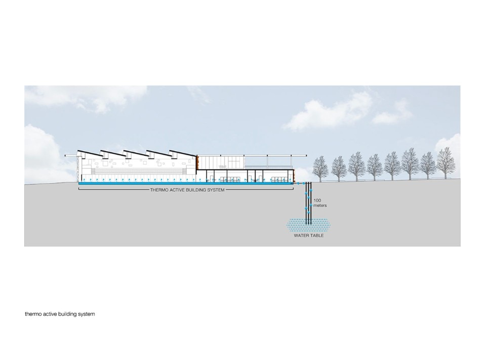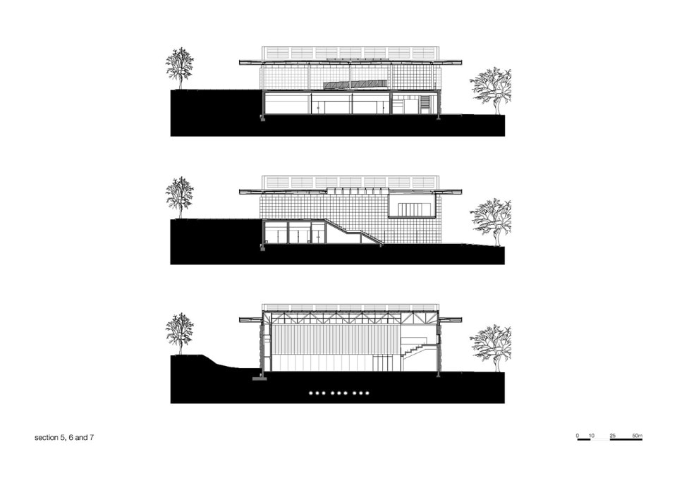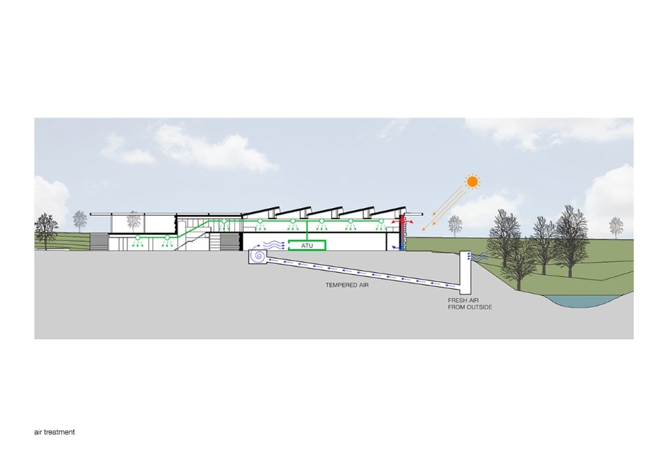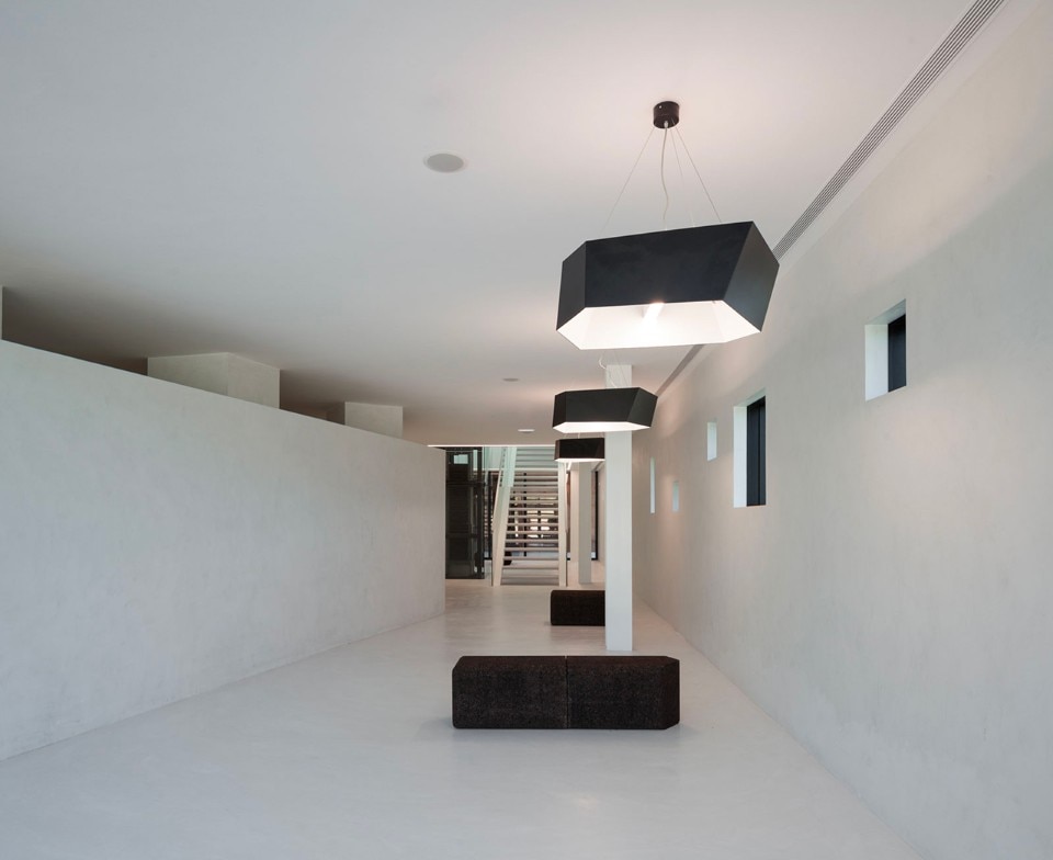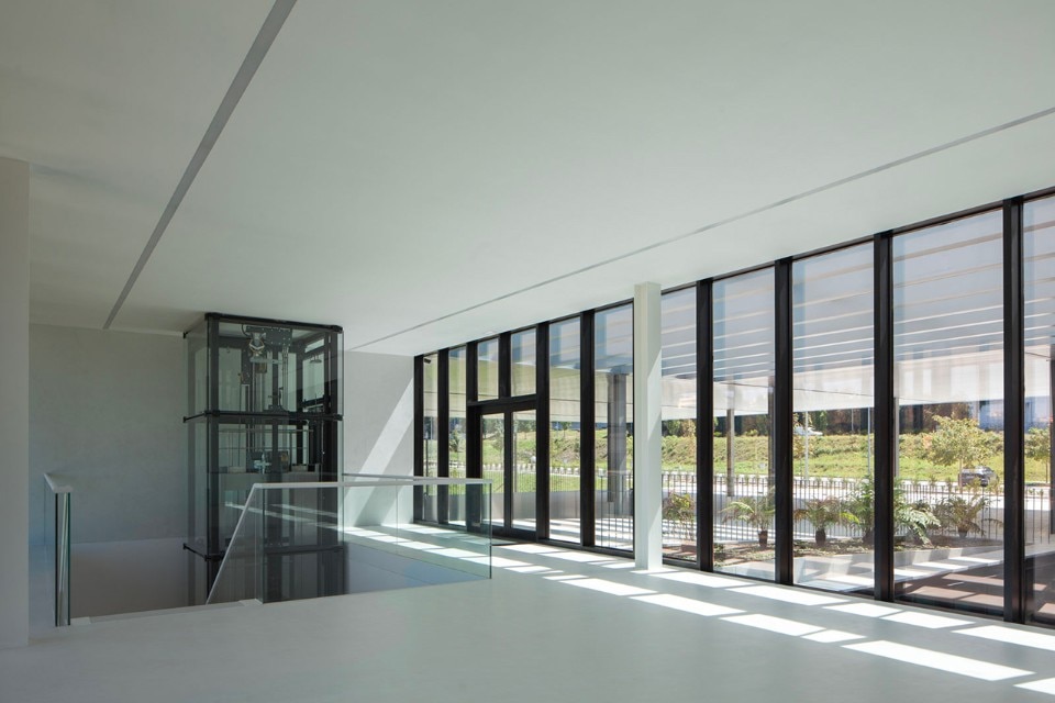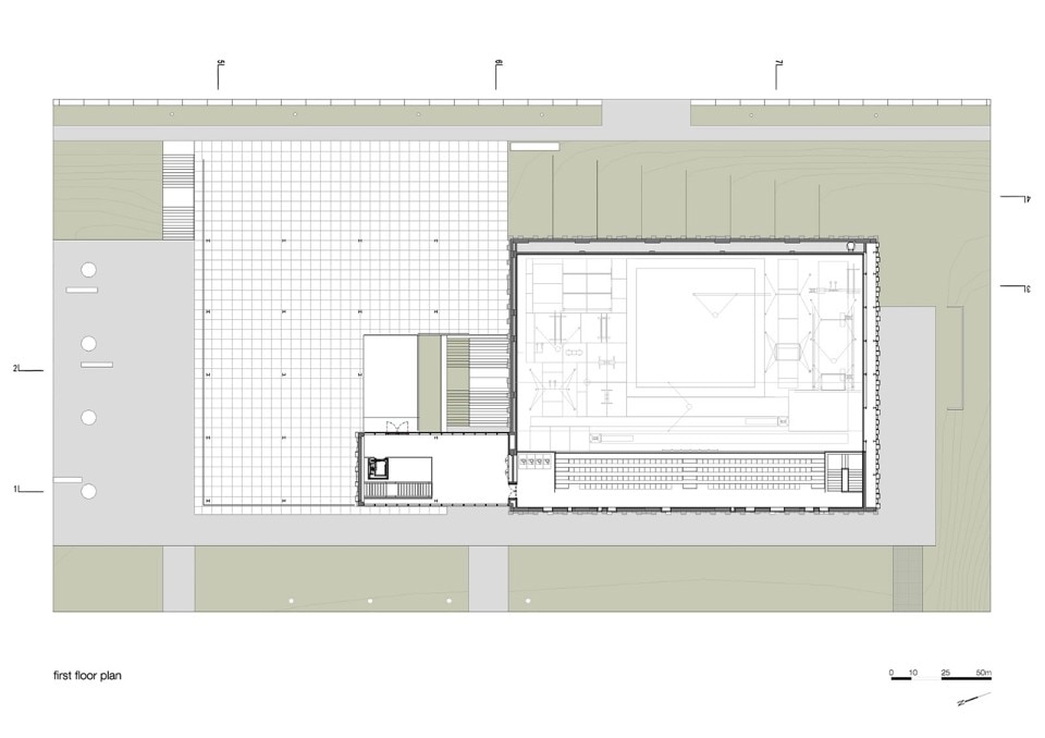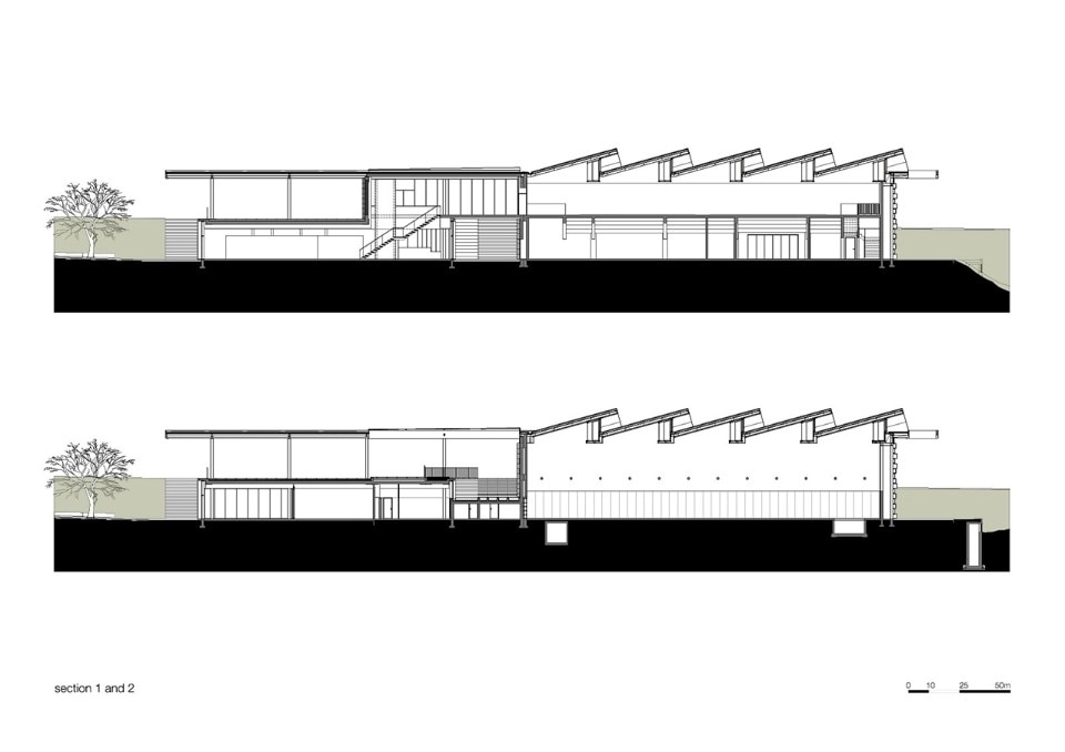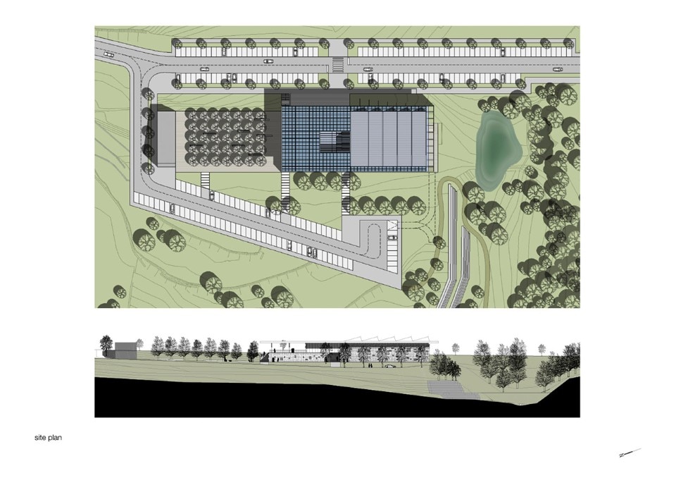 The choice of materials for the building reveals a pedagogic intent and shows environmental concern in the building design, serving the energetic efficiency and searching for a clear balance between technology and architecture. The facade, built from dark agglomerate cork, is a perfect example of that versatility, intending to represent a strong design trait for the project while keeping the association with the environmental sustainability. The building searches for scale and references on the surroundings, using its volumetric presence to create another element for the park walking paths, like the entrance plaza, that not only connects the two levels of the building but also allows the contemplation of the park and the eastern hillside of the city.