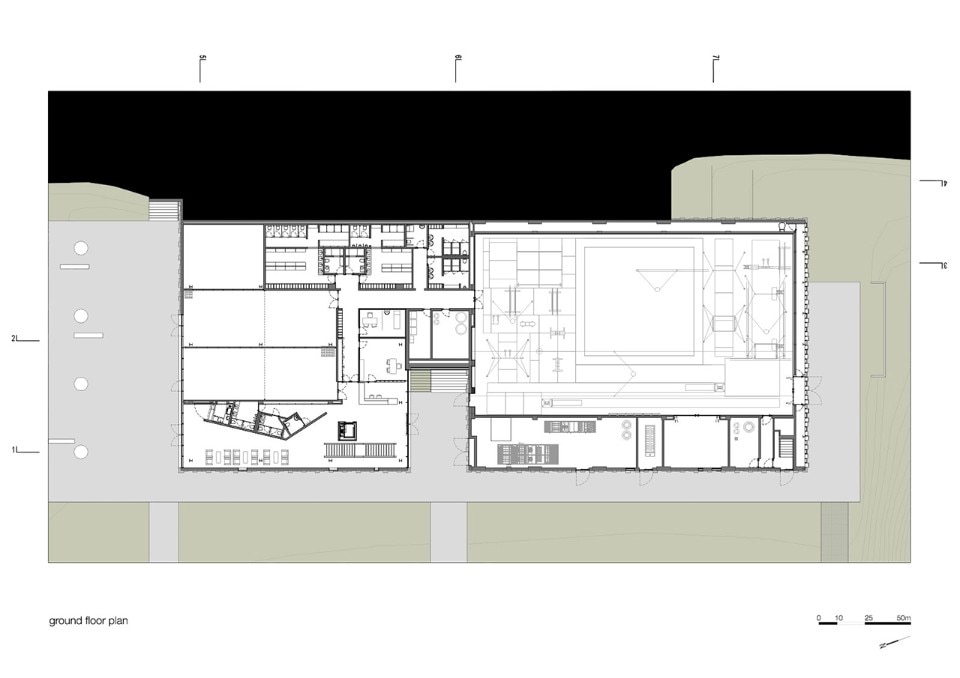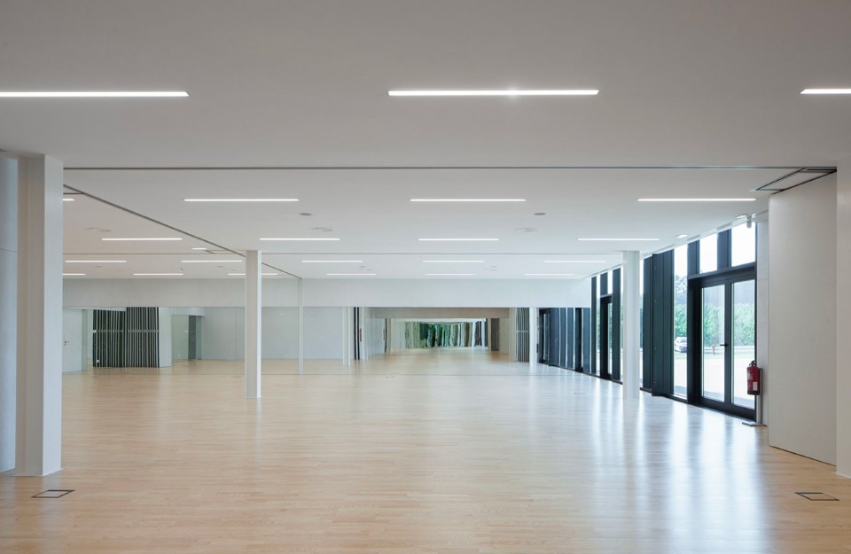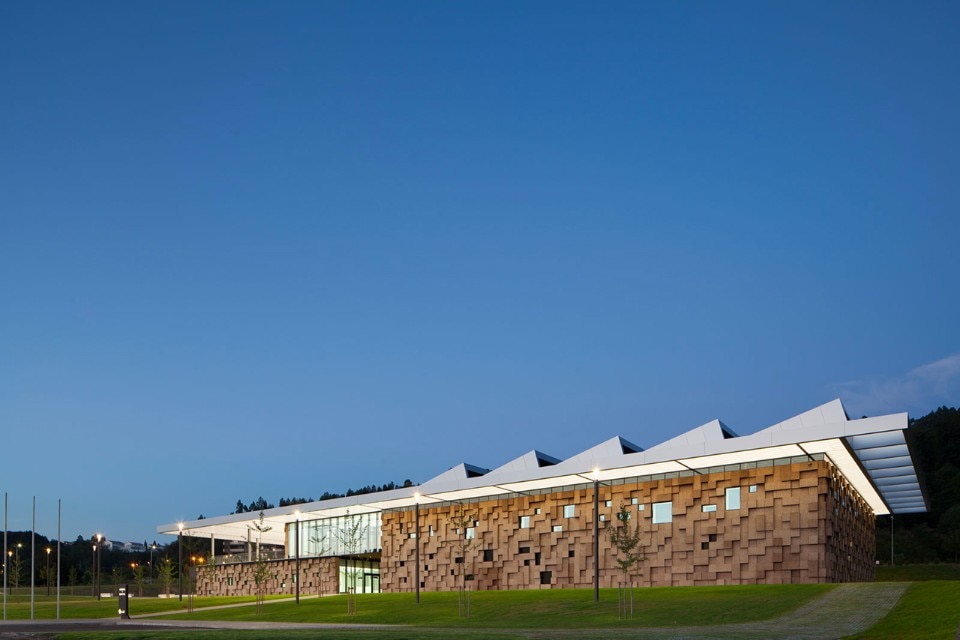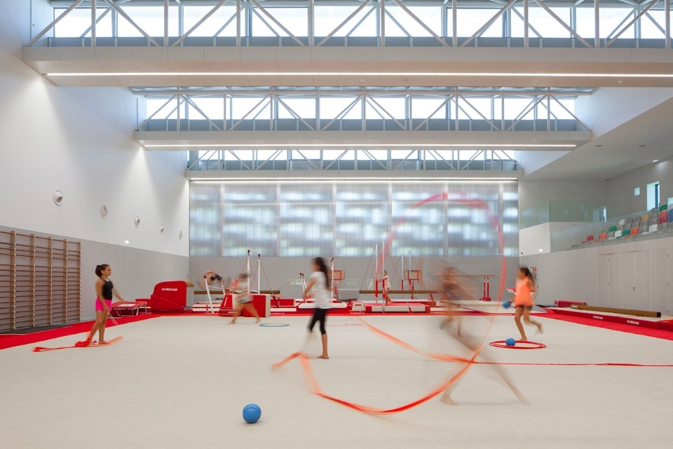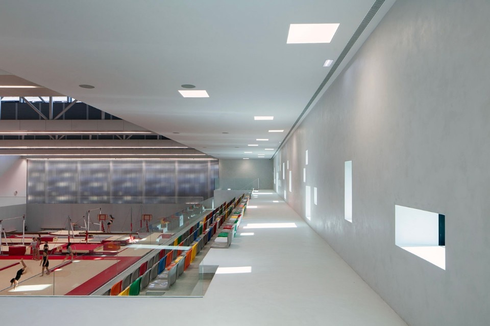 With a 3,200 sqm of covered area, the Gymnastic Training Center of Guimarães is located at the East limit of the city park and was conceived for practice and training of high performances gymnastics. The building sits between two pre-existing streets, both permit access to the building, the one at a higher level is the main street, and the other, on a lower level, limits the city park and is used for exclusive access to the Training Center. The sport center is exclusive for the practice of high performance gymnastic and consists of a pavilion, a gym, locker rooms, administrative offices and public spaces that grant access to the stands.