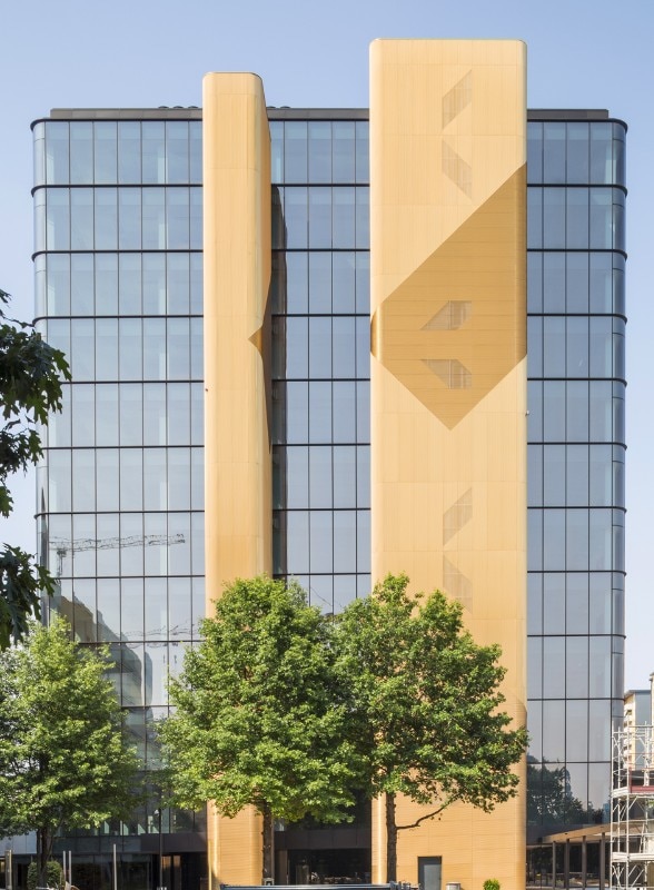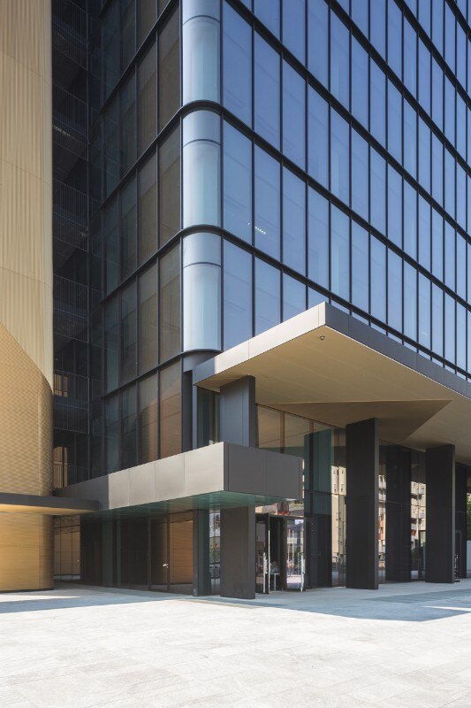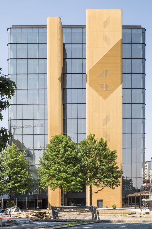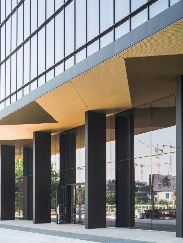 I temi su cui abbiamo lavorato sono la razionalità, la luminosità, la flessibilità e l’accoglienza del sistema delle hall. Nel sistema degli spazi interni abbiamo cercato di creare come una processione nel percorso di attraversamento degli spazi, dall’esterno in cui predomina la luce e l’oro, fino a salire ai piani superiori degli uffici dove si è immersi nella luminosità e nella trasparenza degli spazi del lavoro.