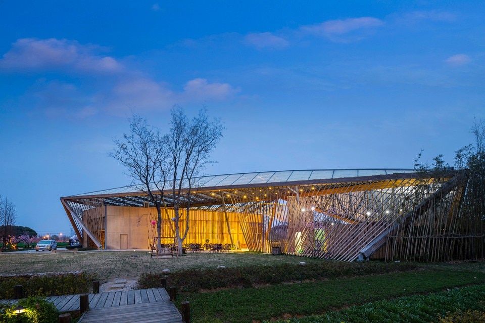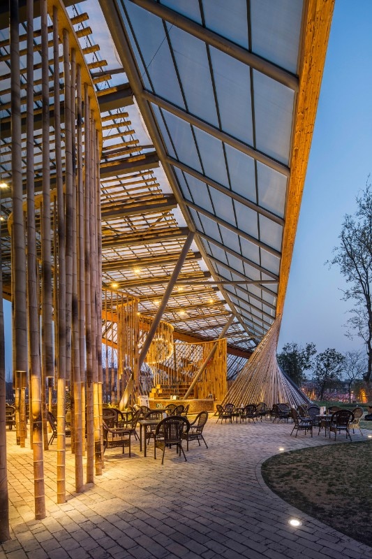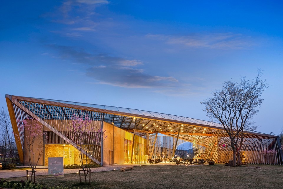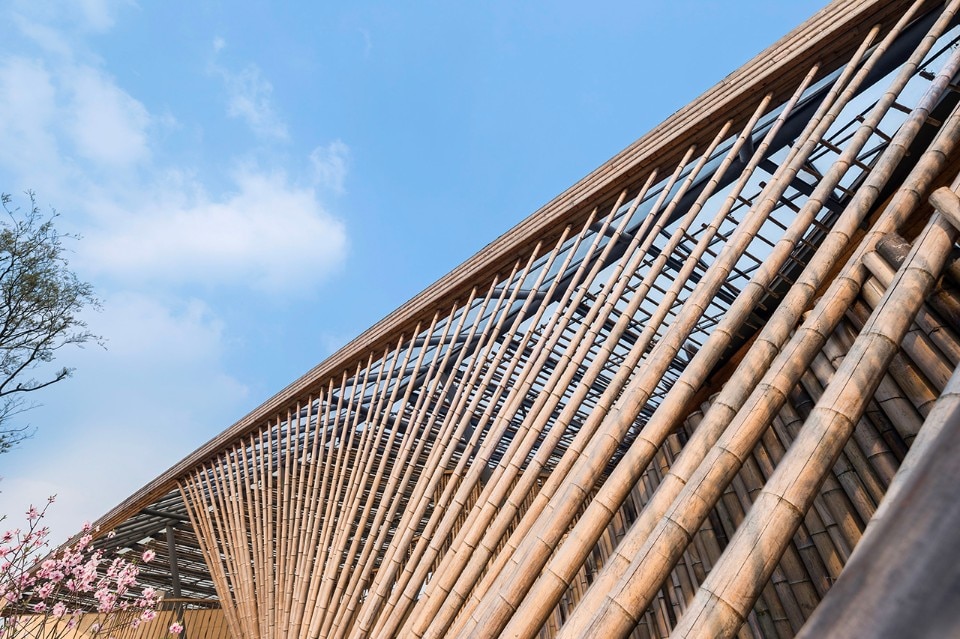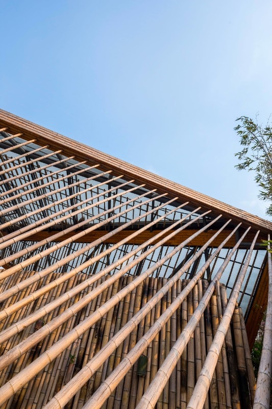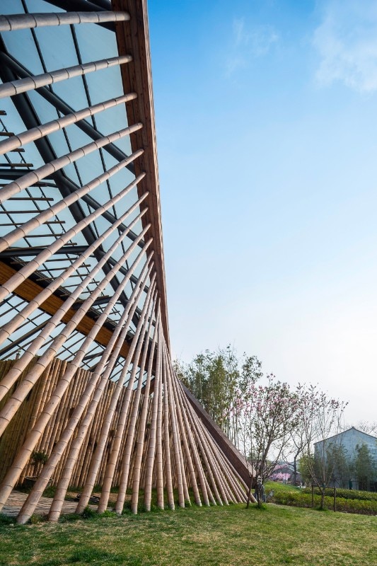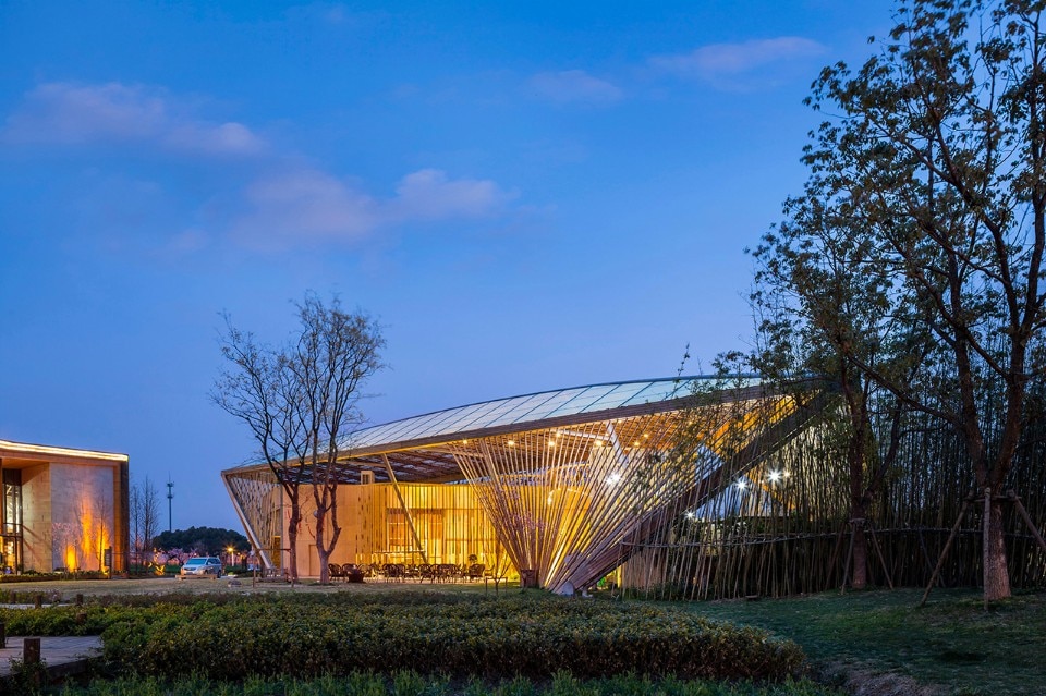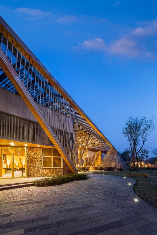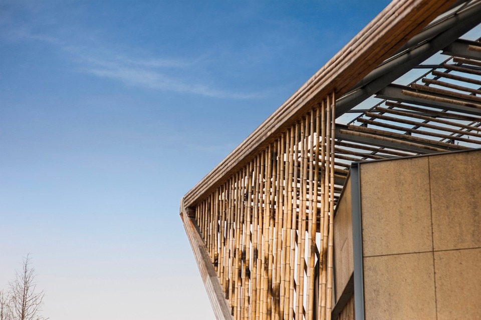 The auditorium displays an irregular triangular shape. Its body integrates the indoor and outdoor sections of the Lecture Hall into a grey structure that sits in the middle of the view to the park. The upper and lower sections are connected with bamboo stems, as crossed elements that form a hyperbolical shape designed to penetrate the line of vision, forming a transparent space with a pulsating atmosphere. Architect Zou Yingxi tried to establish a dialogue between the Lecture Hall and the surrounding environment through the use of ecological materials.