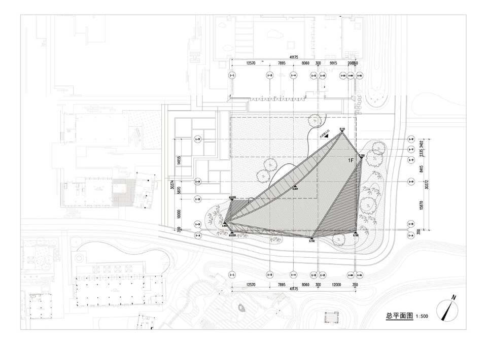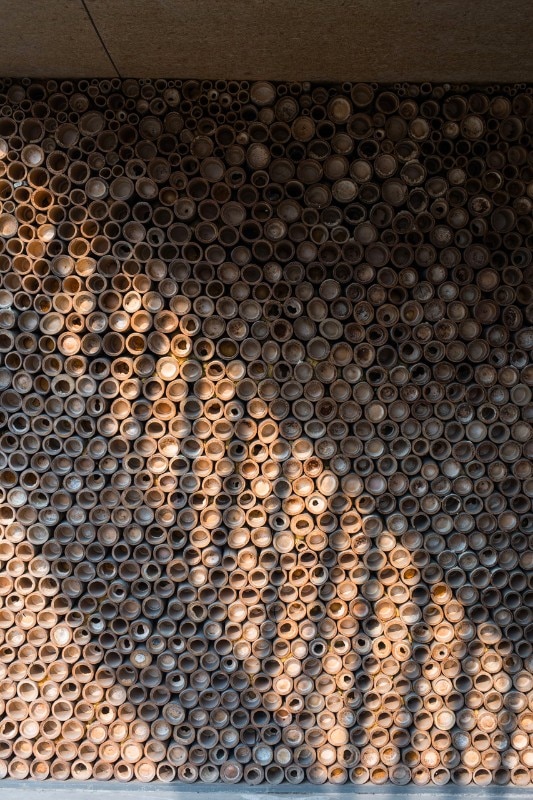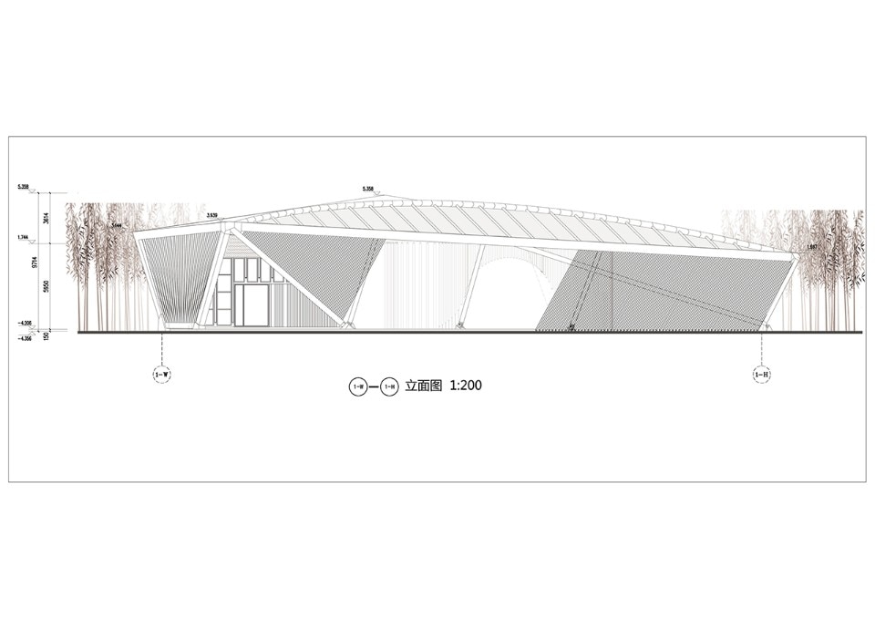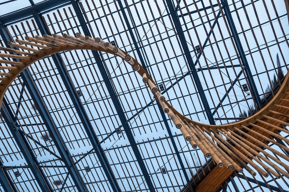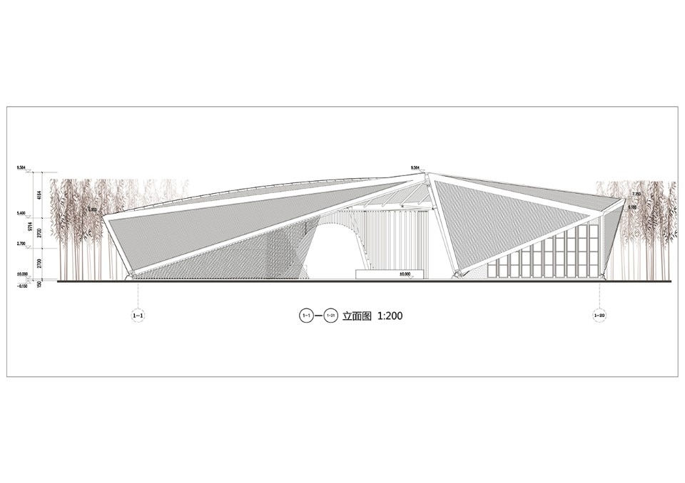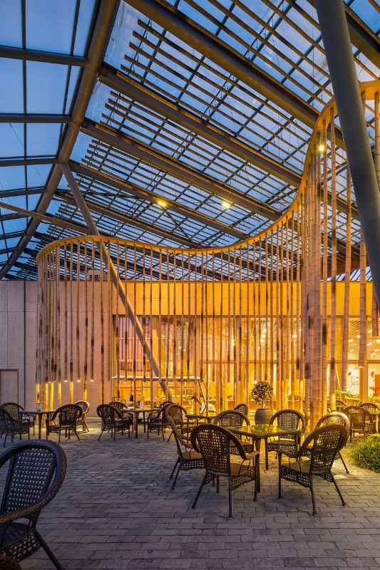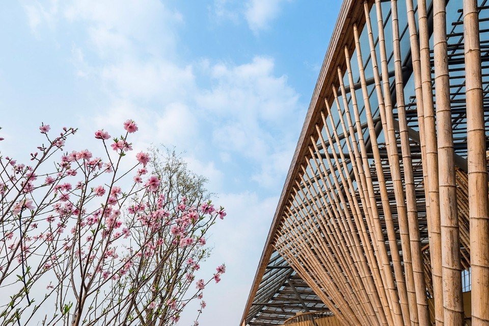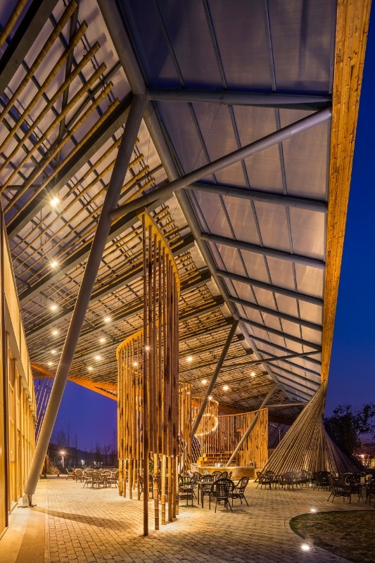 The auditorium displays an irregular triangular shape. Its body integrates the indoor and outdoor sections of the Lecture Hall into a grey structure that sits in the middle of the view to the park. The upper and lower sections are connected with bamboo stems, as crossed elements that form a hyperbolical shape designed to penetrate the line of vision, forming a transparent space with a pulsating atmosphere. Architect Zou Yingxi tried to establish a dialogue between the Lecture Hall and the surrounding environment through the use of ecological materials.