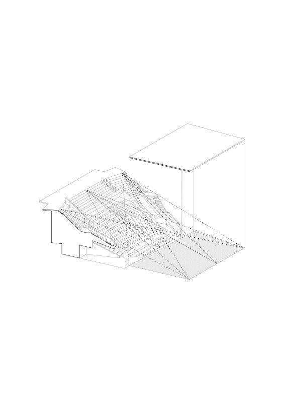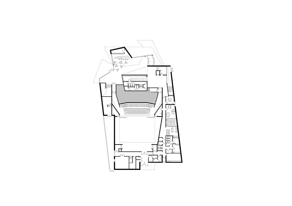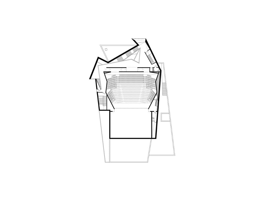 The visitor’s interest is caught by the animation of the volumes: in the upper part, the foyer is offset to indicate the entrance, while in the lower part, transparent elements allow glimpses of the wealth of interior routes and invite the visitor to enter. The foyer occupies a vertical space with a route through an apparent intertwining of staircases leading to the auditorium. Oblique lines reiterating the complex geometry of the site cause spaces to expand, creating a feeling of space.