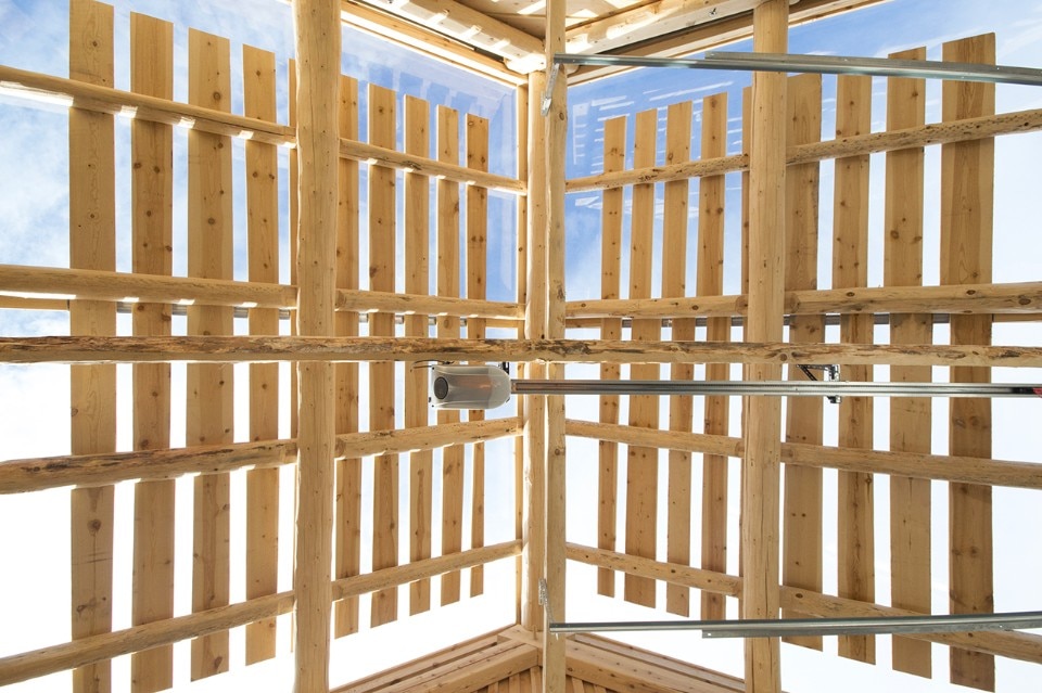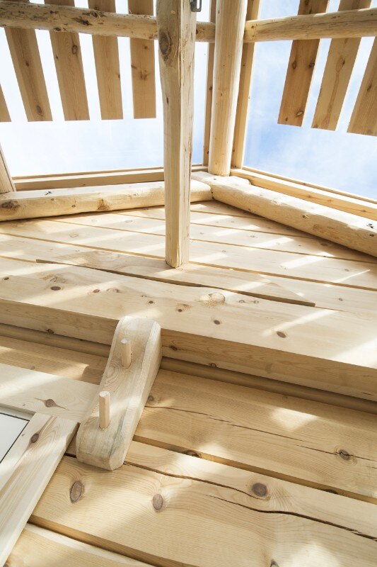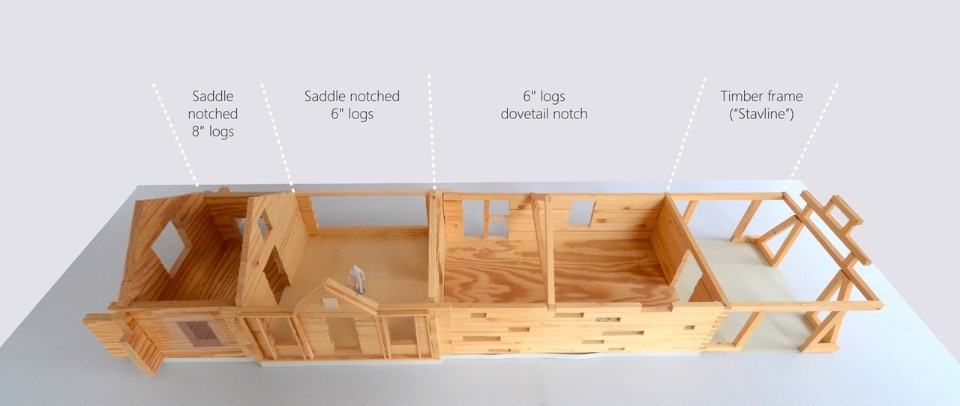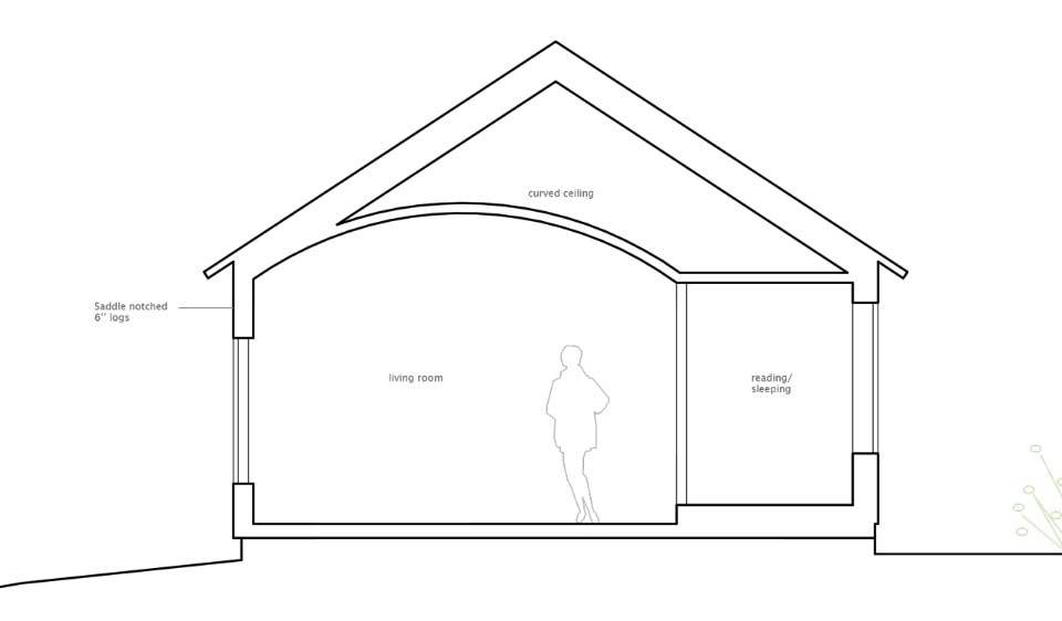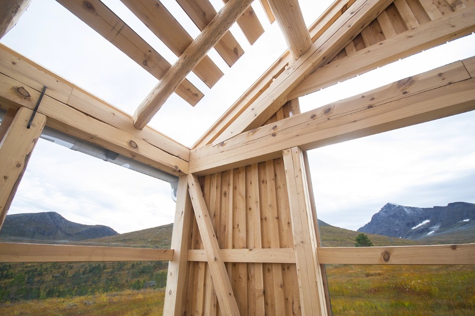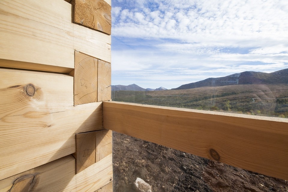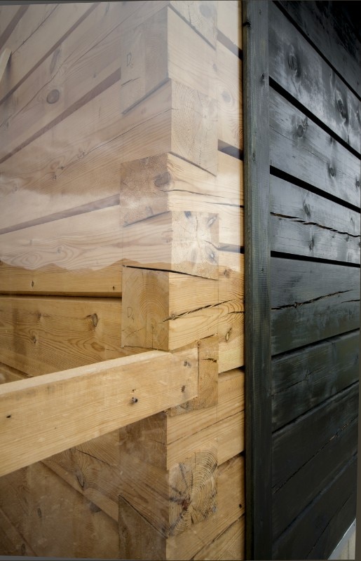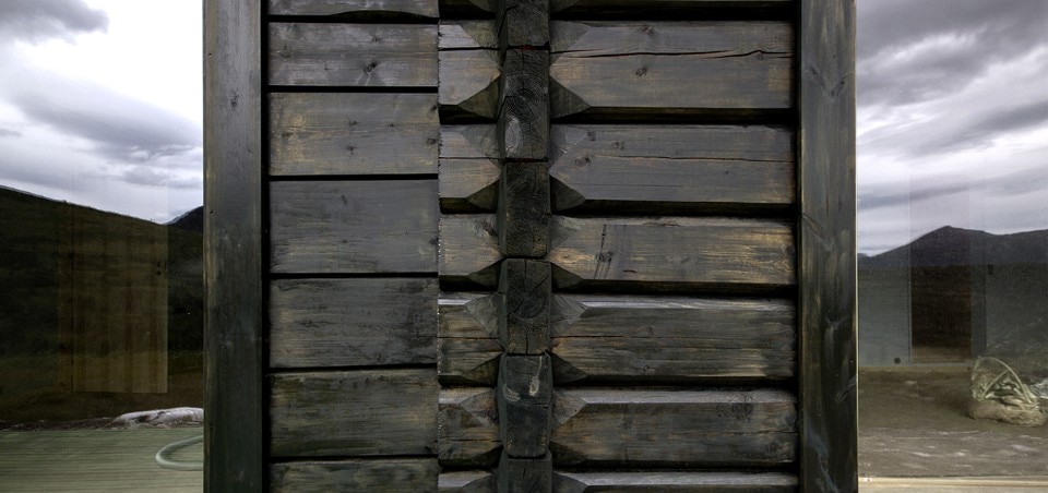 The obligation to the whole is maintained by common coloration in a deep, dark green, tar based timber oil, as well as the common direction of their gabled roofs. At the same time each of the units has its own character as presented by their building technique and window type. In the western facade of the building the individual characters of the different units are most obvious, while in the eastern facade their coherence and the house as a whole is more prominent. The cabin is in this respect can be seen as both a single unit and four separate buildings.