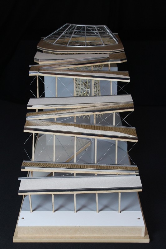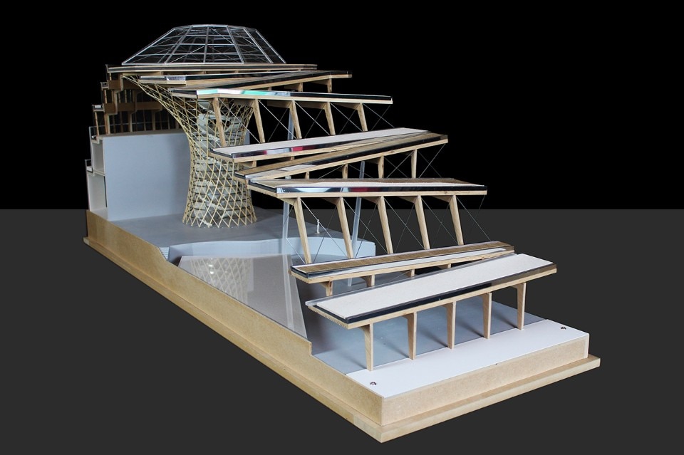 A circuit offers a walk surround the building, extending the board walk promenade. A lift offers the occasion to climb to the top of the walk to enjoy the view. As the origami unfolds, it creates empty spaces. These spaces are filled by large glass panels that let natural light into the aquatic centre and give visitors the sensation of a continuity between the interior and exterior.