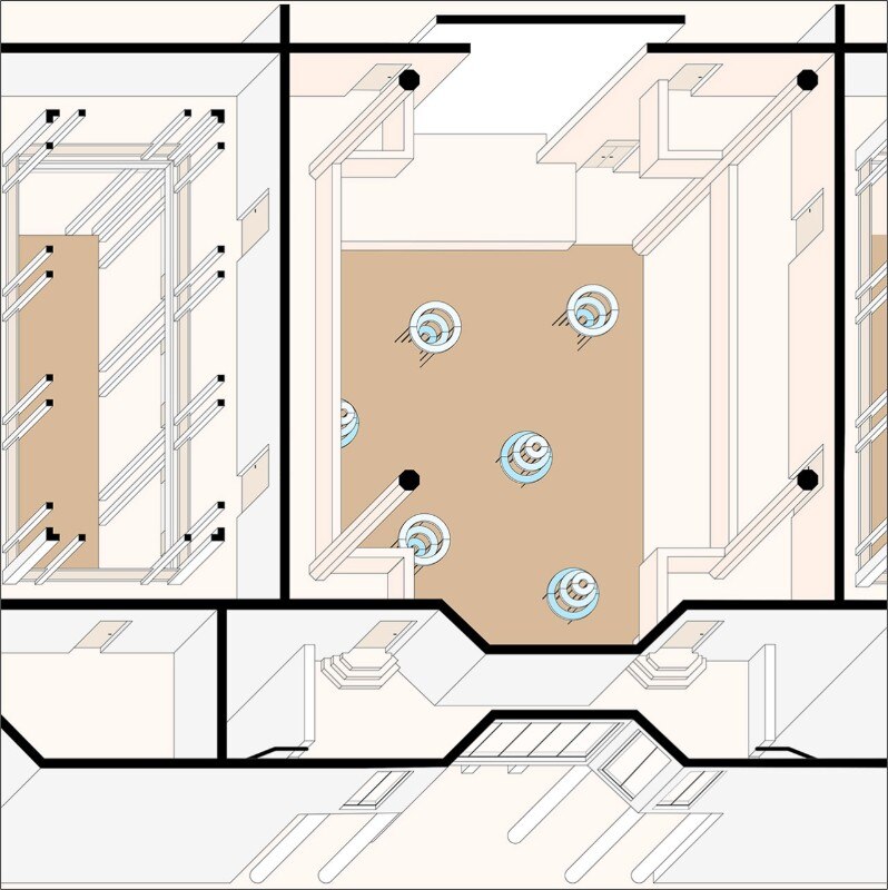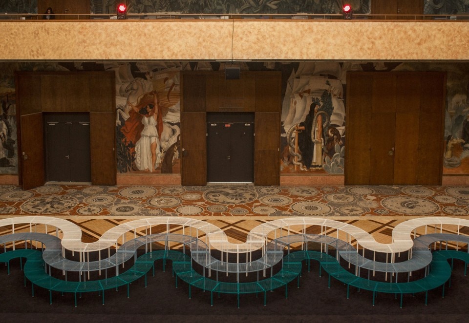 The most vivid expression of this examination of drawing and design is, without a doubt, the Multiple fitting for the central hall of the Palais de la Porte Dorée in Paris, produced together with Matteo Ghidoni. A fitting which transforms the simple forms of a height-adjustable item of furniture into a “composed figure” which offers a multitude of uses and forms of relationship. A bench, a table and a step, through repetition, become an amphitheatre, an infinite surface or a series of unexpected waves. All of this has been created with a metal structure which has been soldered and painted in three colours ranging from white to blue, shades which communicate with the decorative features in the precious hall designed by Alberta Laprade in the 1930s.