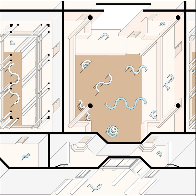 This work demonstrates the synthesis between mark and form, between drawing and design, between interior and landscape, where the forms that share the space with his figures seem as though they are the soul of this construction. “I always try to work with the help of geometry, with its pure forms and elementary systems, because I find, in all the lines and forms that I use, a kind of primitivism that defines me”, says Jean-Benoît Vétillard, and it is in this very search for a true living dimension that we find a world made of shapes, objects and stories for those who inhabit and design space, a theoretical code which describes the highest everyday thoughts of a culture of design which envisages the measure of the present.