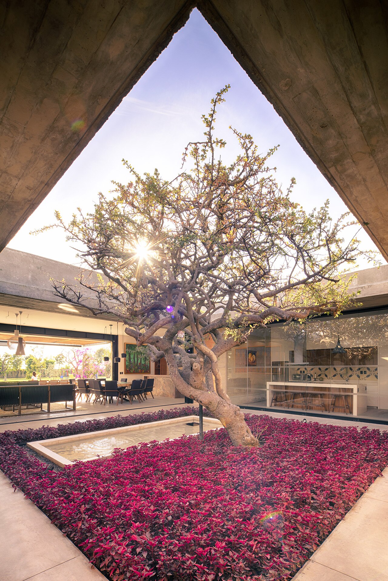 The 545 sqm residence is accessed from the Eastern side, through a walkway that directly conduces to the patio and the South-oriented living area; this space overlooks a swimming pool, equipped with a wooden deck. The six bedrooms are directly connected to the central patio, each of them has a private bathroom. The night area corresponds to the Northern and the Eastern sides of the building. The mineral texture of rammed earth moulds the atmospheric qualities of the residence, accompanied by smooth concrete and wood in the finishing and floorings.
