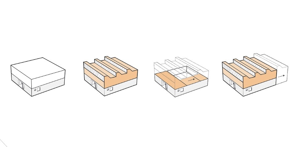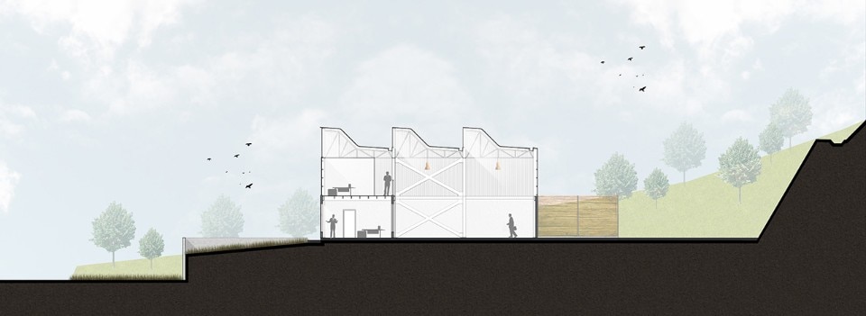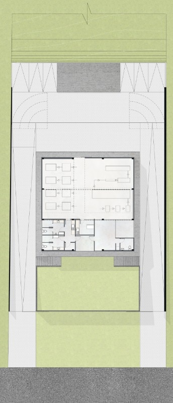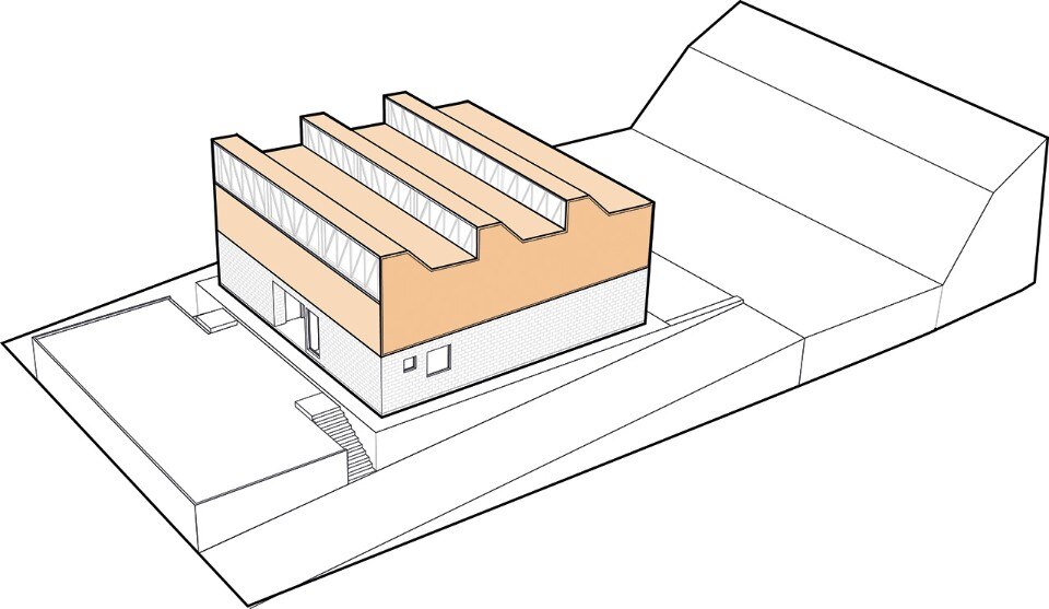 In the project, the priority has been given to the internal logic producing a simple form. The squared-plan is divided in three spans that correspond to the modules of the roof: three skylights open towards East.