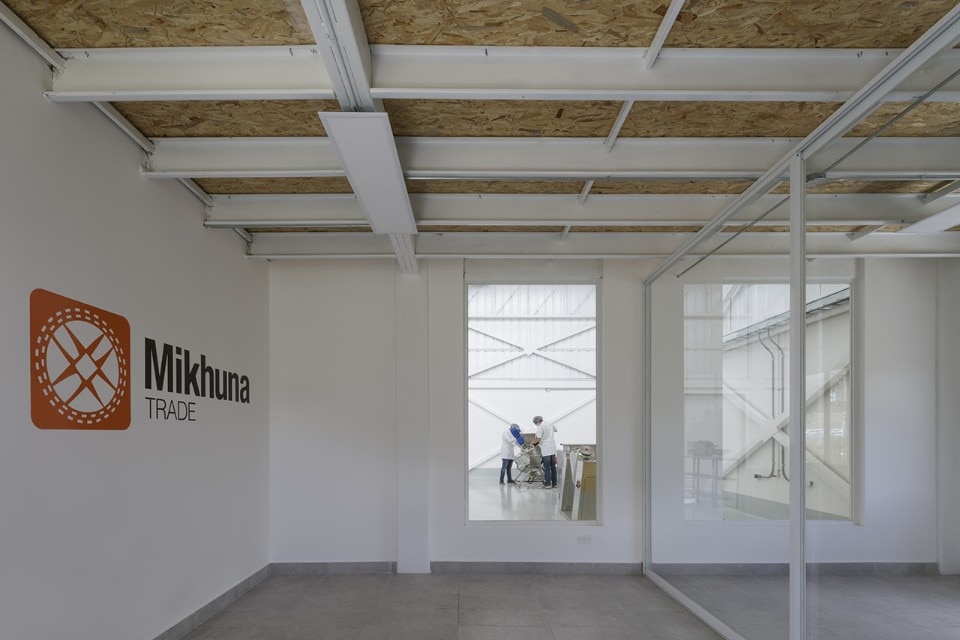 From the lateral flights of steps that run parallel to the east elevation, a central door gives access to the building. The first space the visitor meets houses the office area, which is distributed on two floors and occupies one of the three spans of the roof structure. The other two modules are dedicated to the productive activities and host the machineries dedicated to the processing of raw cereals.