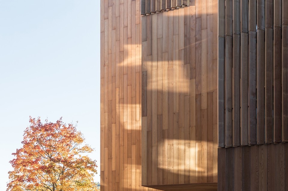 Built on a flat site surrounded by residential blocks on two sides and a park on the other, the building alternates cedar wood cladding and glass following the orientation. Indeed, when walking around the building, the cascading landscape changes constantly, revealing the presence of a dominant material on each side: glass to allow the view on the Gärdet national park and to let the daylight enter the units, while cedar planks are placed where visual or thermal protection is needed.