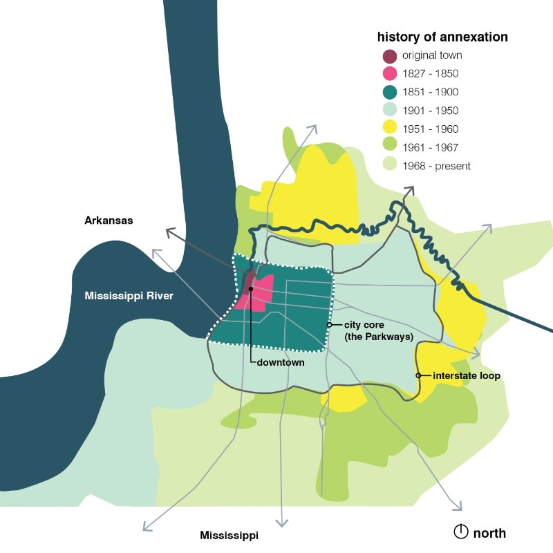 The people who arrived in Memphis during this time—entrepreneurs, ship captains, sharecroppers, enslaved people, and musicians—are the same ones who helped shape the city’s culture. The Mississippi River has also influenced the city’s growth pattern and cultural fabric significantly. Like other coastal cities and cities along large rivers, Memphis’ growth patterns have been impacted by its geography. The nearly one-mile wide river bound the city from expanding westward. As a result, the city core—it’s geographic and cultural heart—is not entirely synonymous with the historic downtown. Rather, we view the area inside the Parkways (North, South, West, and East Parkway) as the city core.