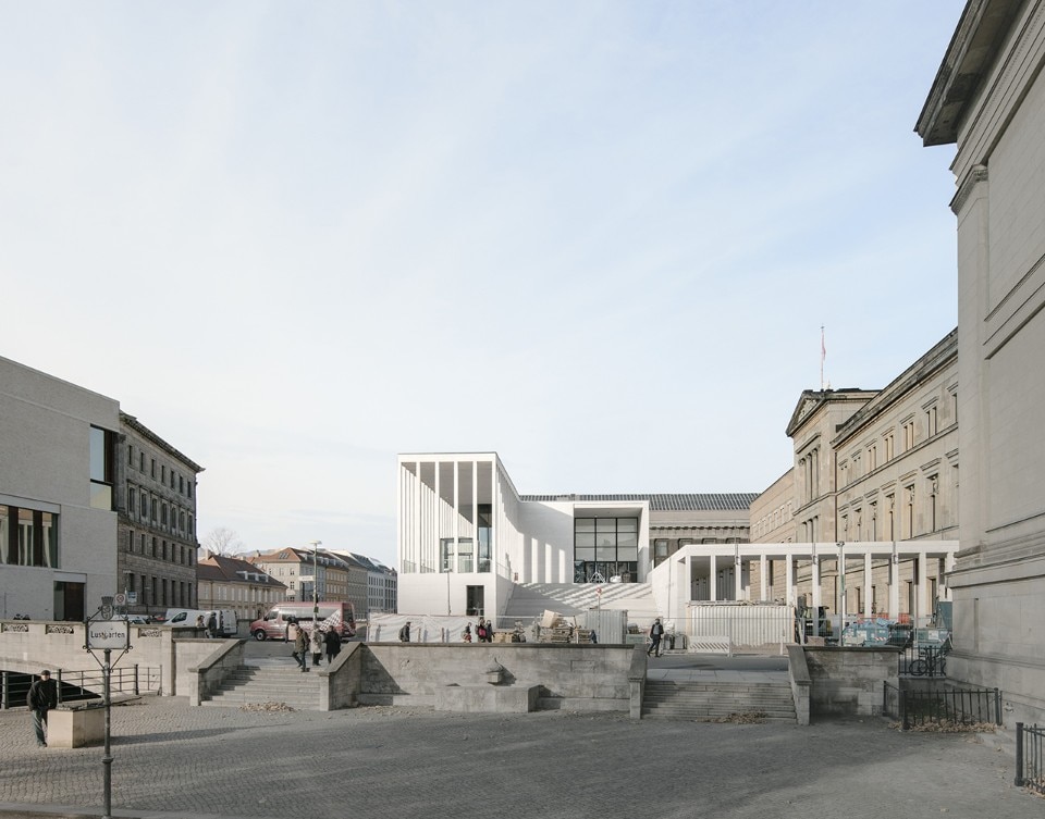 The high stone plinth reinforcing the Kupfergraben canal’s bank, the tall colonnade rising up above it and the monumental stairway overlooking the Bodestrasse are just the most overt quotes to the Museum Island’s shape, as it was built and imagined by the leading figures of German neoclassicism – such as Karl Friedrich Schinkel and Friedrich August Stüler.