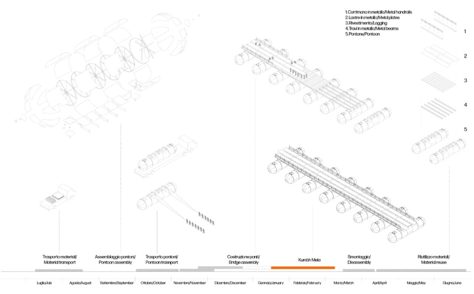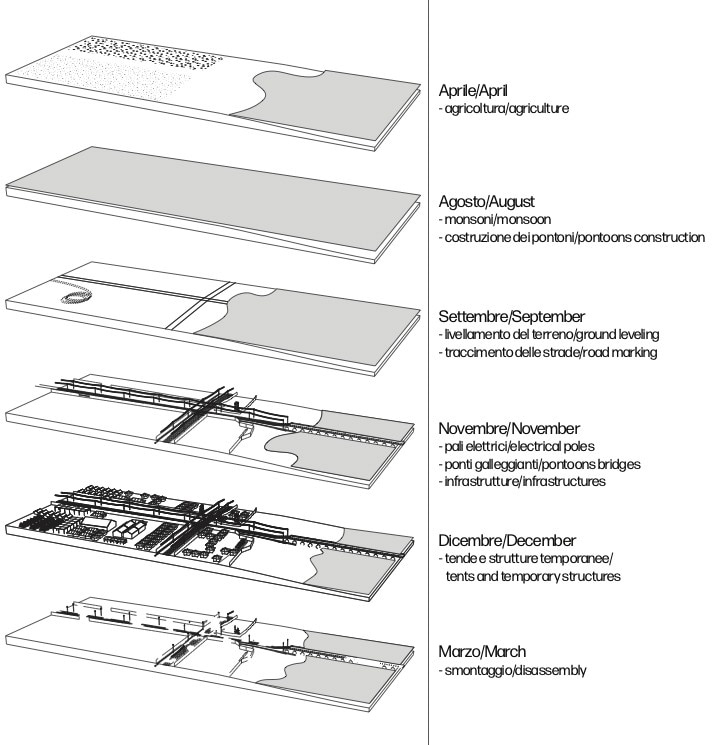 Instead of being paved, for example, the roads are built with steel plates that can be carried by local workers without any heavy machinery. Being easily dismantled, the ephemeral megacity can then recycle most of its construction materials and reintroduce them into the regional economy once the festival is over.