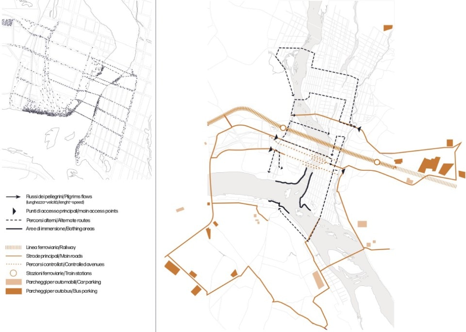 An intense flow of people is the defining feature of this event. Crowds of 10 to 30 million people arrive in 24-hour cycles on the six main bathing dates, between 15 January and 4 March, often after waiting days for their opportunity to bathe for a few seconds. To accommodate this massive human gathering, a temporary settle- ment is deployed in just three months, taking the shape of a proper urban environment – with over 300km o fstreets, nearly two dozen pontoon bridges, thousands of cotton tents and venues for spiritual meetings as well as social infrastructures such as hospitals and vaccination clinics. It is, in effect, the biggest ephemeral city in the world!
