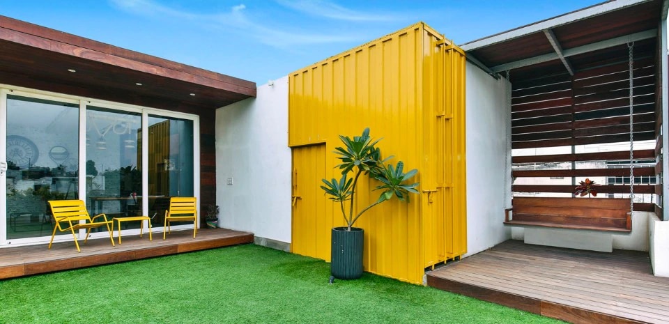 Studio Wood designed a modular structure on the roof of a 366 square metre house in New Delhi, India. They opted for the reuse of container walls. The exoskeleton consists of metal beams covered with lightened steel panels. The construction process began with a grid of beams placed on the roof to raise the floor off the ground. This project is a multifunctional house: it can be used as a studio during the day and as a place for entertainment at night. The space is divided into three zones: a completely outdoor one, a semi-open porch and a closed room.