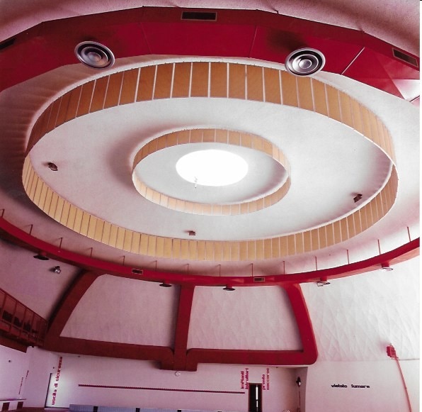 On the outside, colour plays a key role, although unfortunately today the colorful stripes have almost completely faded away. The shape of the dome itself is enhanced by the use of warm colours, such as yellow and orange, which are not used as “make-up” to cover the concrete skin of the dome, but rather as an architectural element that completes the work itself, suggested also by the title “Zebra Dome” of the article published in Domus 567 in February 1977. In fact, the texture of the building is reminiscent of a zebra’s striped coat, enhancing the expressive potential of the spherical dome.