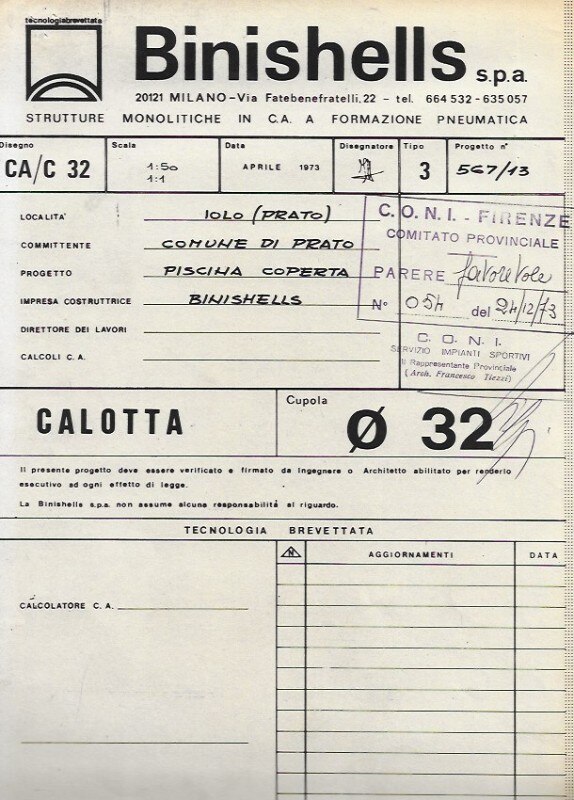 The new construction technology was applied in twenty-three countries around the world, for more than 1600 projects. Among these, there is the public swimming pool in Iolo, in the province of Prato, designed by architect Marco Meozzi. Meozzi used the Binishell system to create a dome with a 6 cm thick membrane-shell, measuring 32 metres in diameter and covering a 25 Meter pool. The structure also includes a small grandstand for spectators, changing rooms, a first aid room and other essential services.