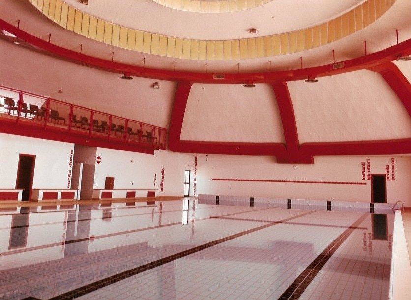 The skilful use of colour emphasises the form and seems to resort to the principles of architecture inspired by a “pop” process typical of the art world, from the “humourous” feeling conveyed by the texture, which also recalls a circus tent, to the alienation from the surrounding area. Inside, too, we can detect architectural signs reflecting the cultural and stylistic trends of the Seventies, such as the unusually large and out-of-scale signs marking the various rooms. It is precisely the interior of this swimming pool that became the setting for some scenes of the film Berlinguer, I Love You, directed by Giuseppe Bertolucci (1977) and starring Roberto Benigni, who was born near Iolo, in Castiglion Fiorentino.