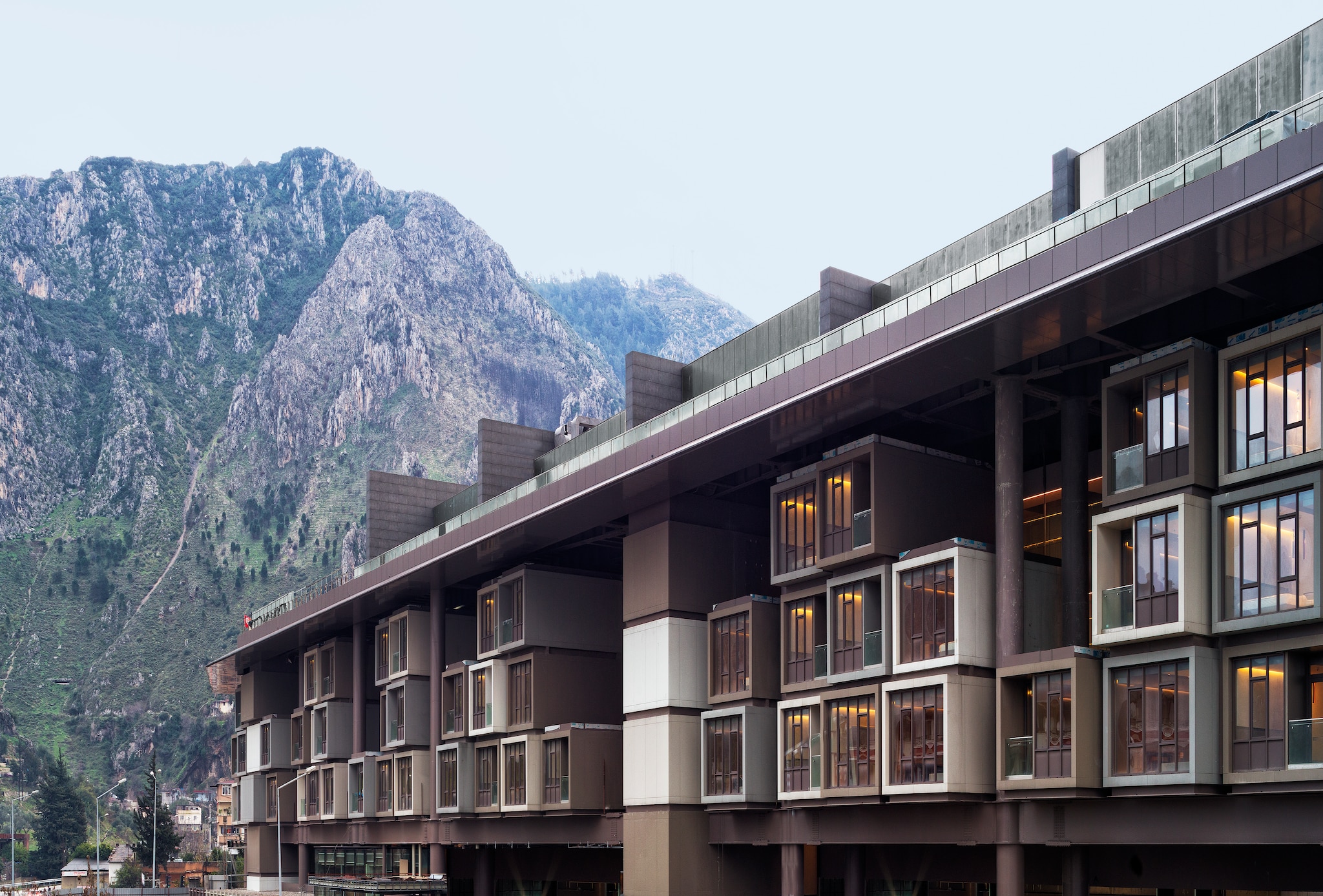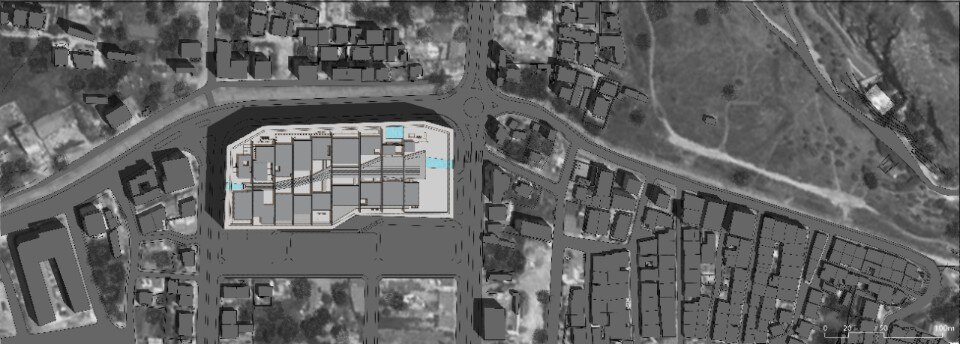 The entire complex is crowned by a great inhabitable canopy, an urban landmark hosting the hotel functions usually located at ground level – such as the restaurant, swimming pool, gym, and ballroom. The architectural idiom employed offers a reinterpretation of the local historical architecture. The openings embedded in the canopy, fitted with olive trees, refer to the traditional courtyards in Antioch’s old town.
