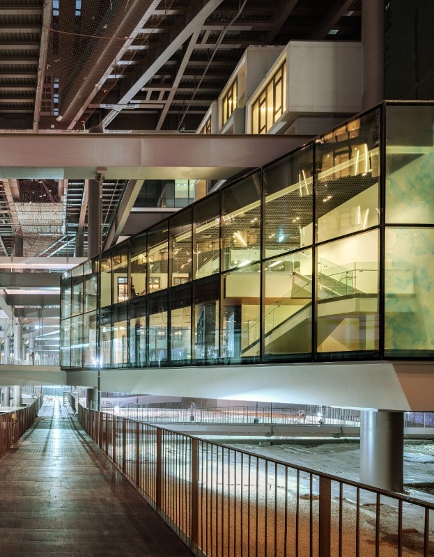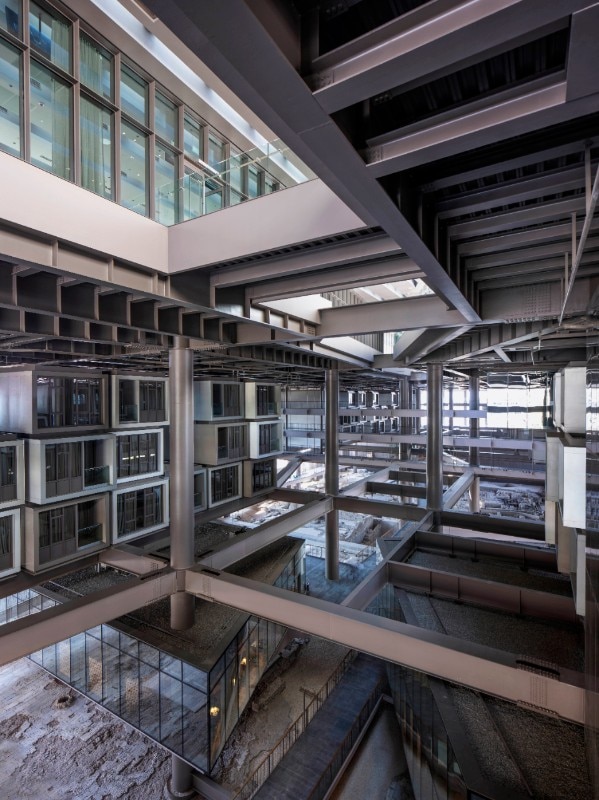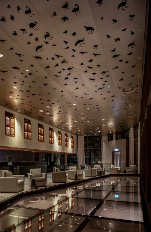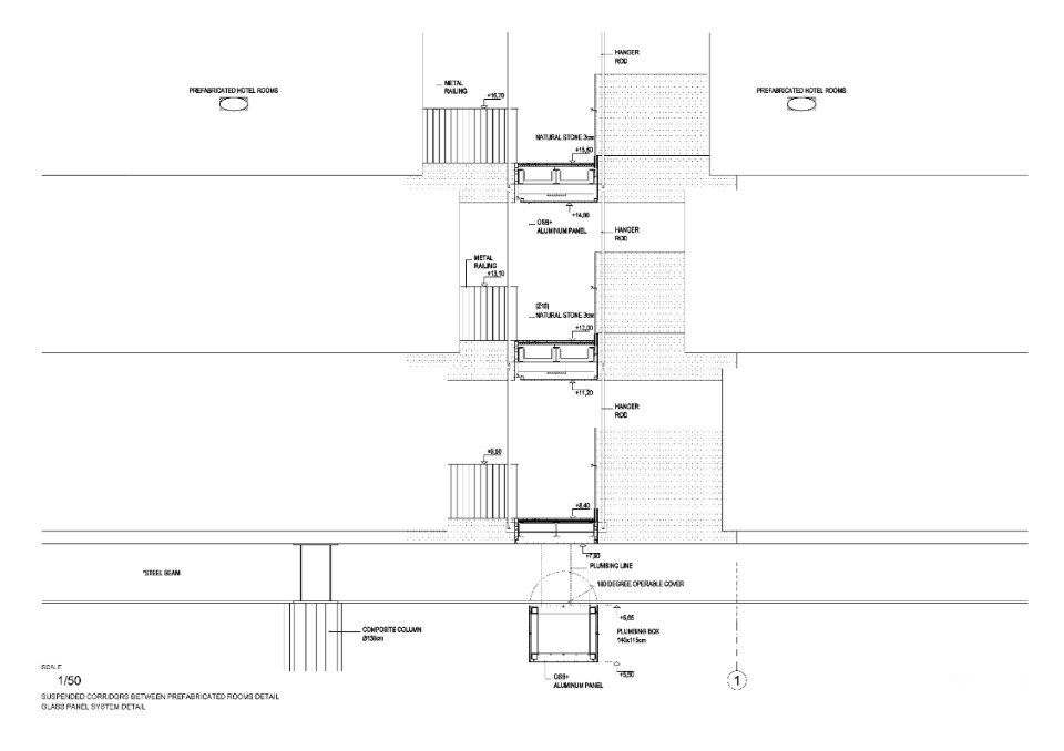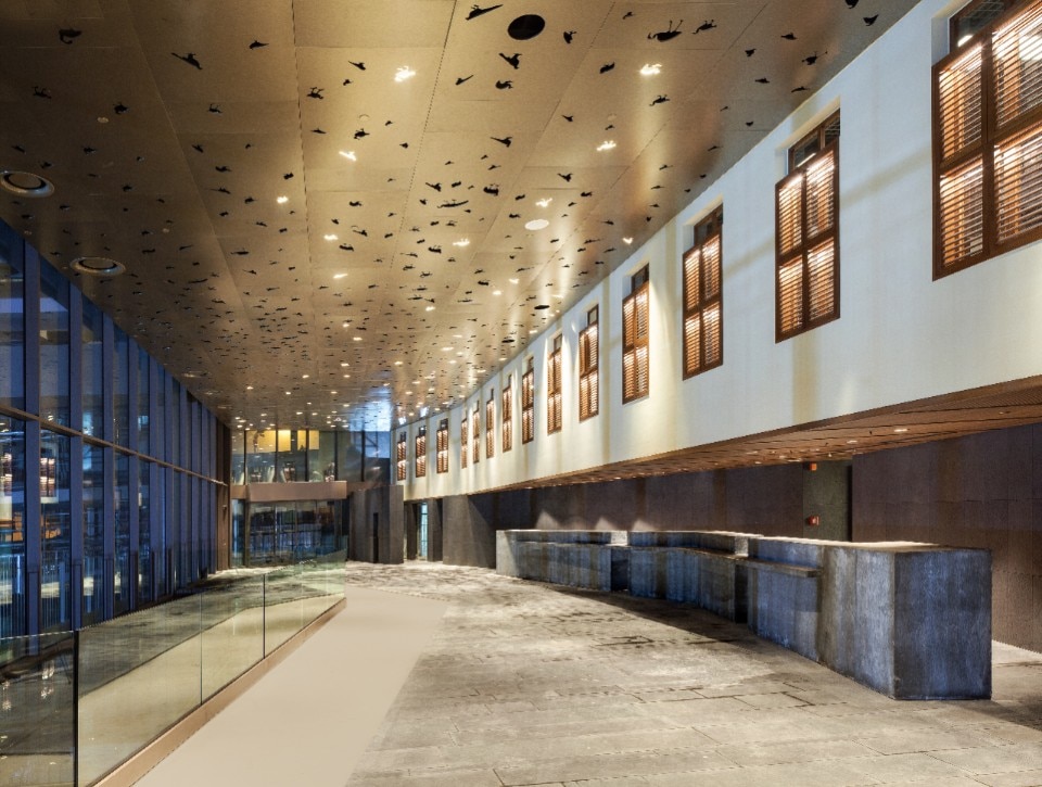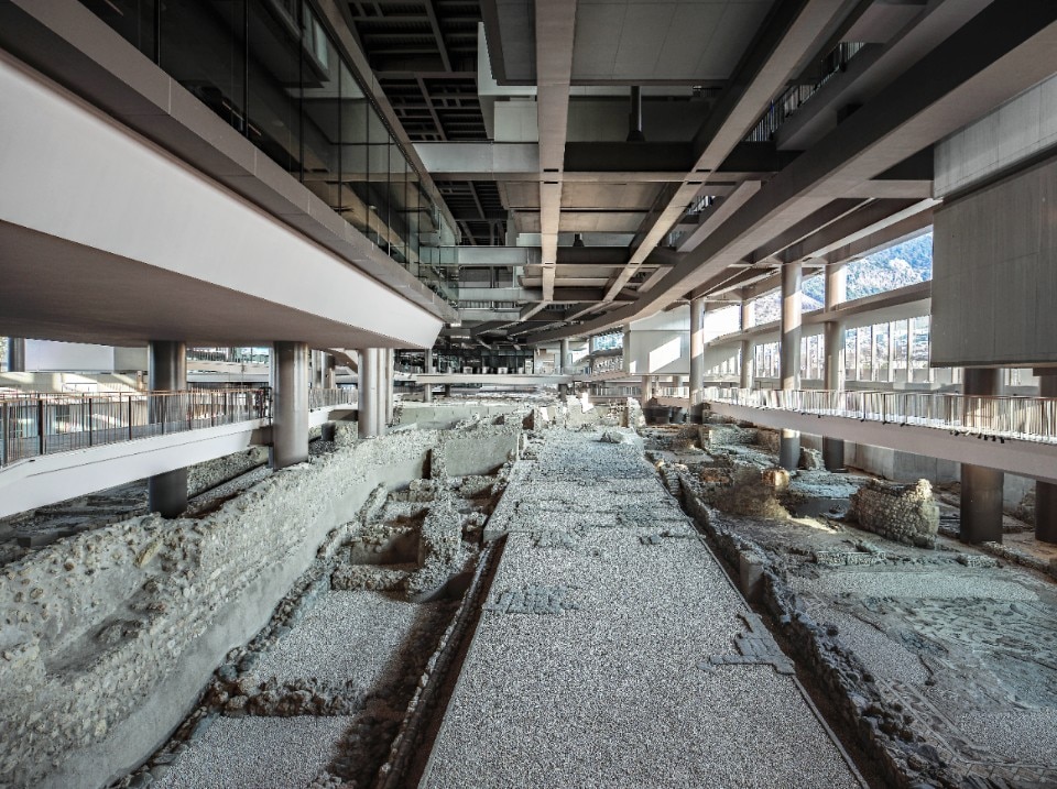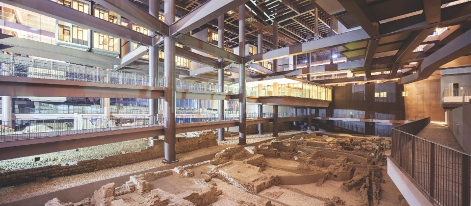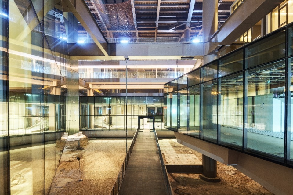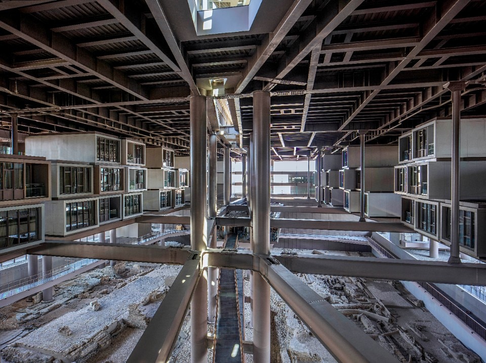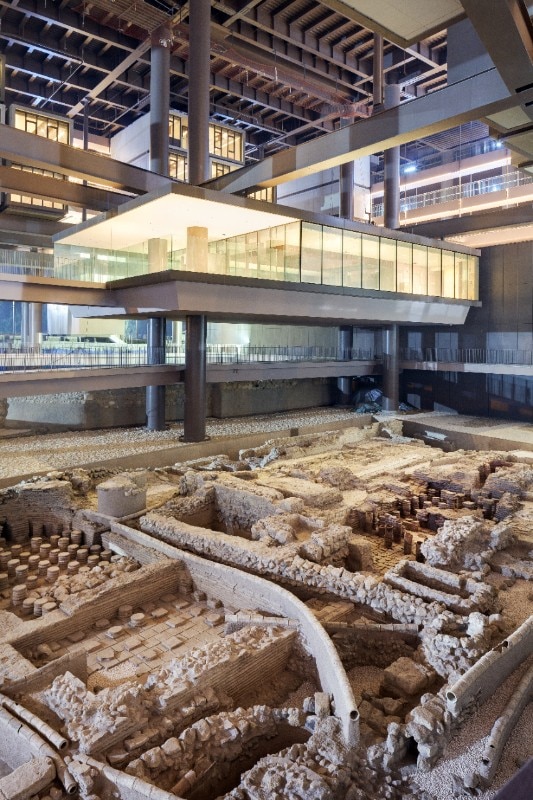 The visual connections between the archaeological level and the various layers of the complex are one of the project’s defining features. The findings are visible from the hotel rooms, prefabricated structures placed onto the grid at about 15m, as well as from the underlying lobby.