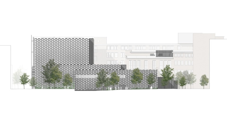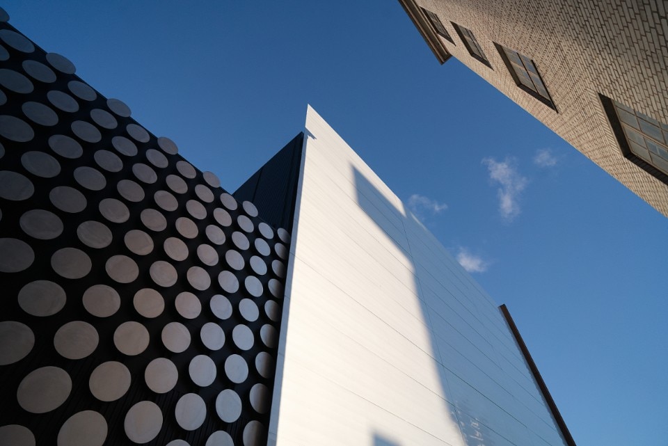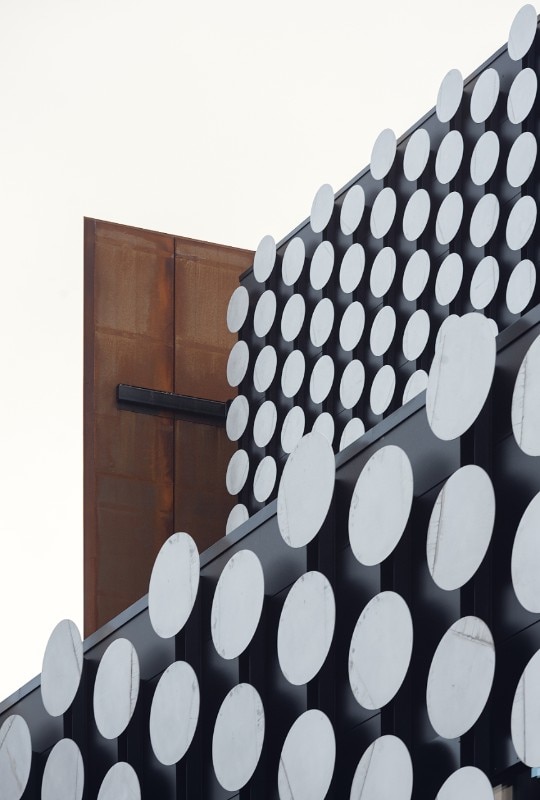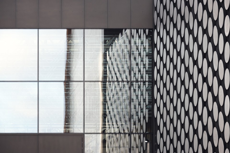 The acades were custom-designed using laser welding technology to create bespoke sandwich panels with the largest possible surfaces. In the evening, the satin like steel wall of the entrance square forms a gigantic surface for reflections and light, and can become part of the scenery for dance events. Overlooking the park, the north facades are covered by hundreds of circular aluminium discs that create abstract rhythmic surfaces.