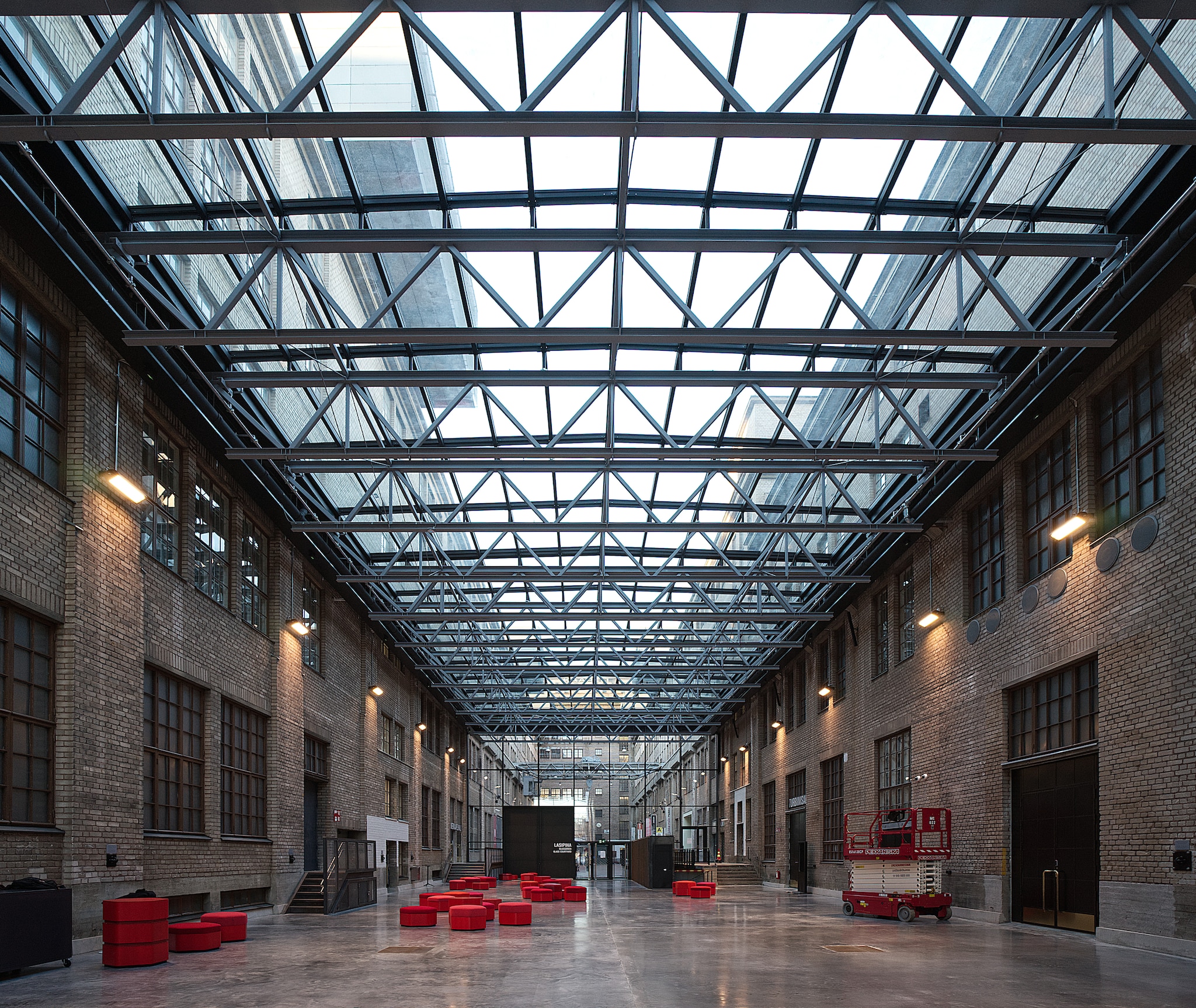 The Dance House is like a huge modern “dance machine”, and its machine-like quality can be sensed everywhere. The project, combining new and old, contains 7,000 square metres with two black-box dance theatres. Erkko Hall is the largest dance performance space in Nordic countries. Measuring 26 x 37 x 24 metres (height), it includes a tower for scenery and a mobile 700-seat telescopic seating system, and the hall can accommodate up to 1,000 people. The old Pannu Hall has been redesigned into a smaller black-box theatre space for 235 to 400 people. The project also features a glazed roof to cover the outside courtyard space, transforming it into a multifunctional entrance area, in between the Dance House and the Cable Factory. Inside, dance can spread throughout the entire building: from the lobby to the training studio, to the restaurant and cloakroom. In addition, technical solutions allow the stages to be changed in shape and location.