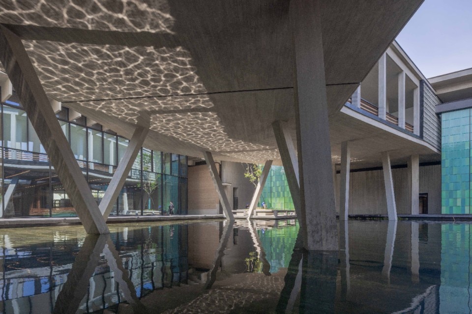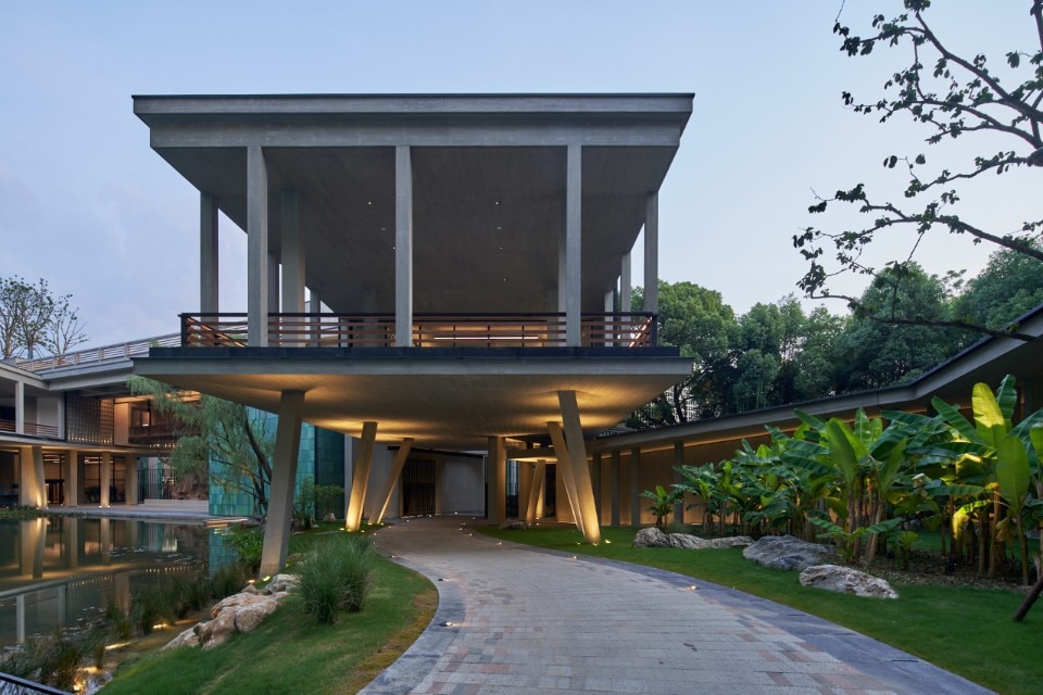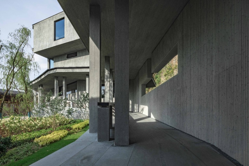 In traditional Chinese landscape paintings, atmospheric vapour often brings the sky down to earth, while rock and vegetation defy gravity’s pull. Displacement of levels also occurs in this project’s walkways, found variously at grade, bridge height or roof level, apparently interchangeable because of geometrical alignments and the use of a single material for different purposes. Complementarity between opposites can also be seen when the plans of passages are considered together, with vantage, arrival or departure points superimposed.
