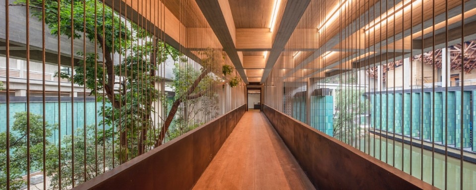 As one moves through this project’s several buildings, alternations of elements, materials and surfaces present themselves continually. A line of tall louvre-like panels clad in bright green tiles parallels one’s path towards a sombre grey wall. Antithetical characteristics also appear in the juxtaposition of the compressive and tensile supports of a suspended walkway. In these two cases and many others, a sense of vitality results from antithetical elements acting in response to one another. Repetition would render arrangements lifeless. If we accept the thesis put forward by the building – alternation everywhere and without end – we reach the startling conclusion that good architecture has no overall form. Discrete forms yes, but no form of the work as a whole.
