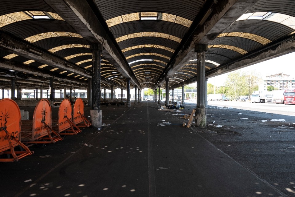 The new logistics pavilions are almost complete, but sadly, some of the remarkable historic pavilions from the 1965 construction designed by city engineers Amorosi, Parrella, and Cattorini will be demolished. These buildings are often overlooked as anonymous architecture, but fortunately, one pavilion will remain as a memorial of this historic piece of the modern city and as a venue for public activities.
