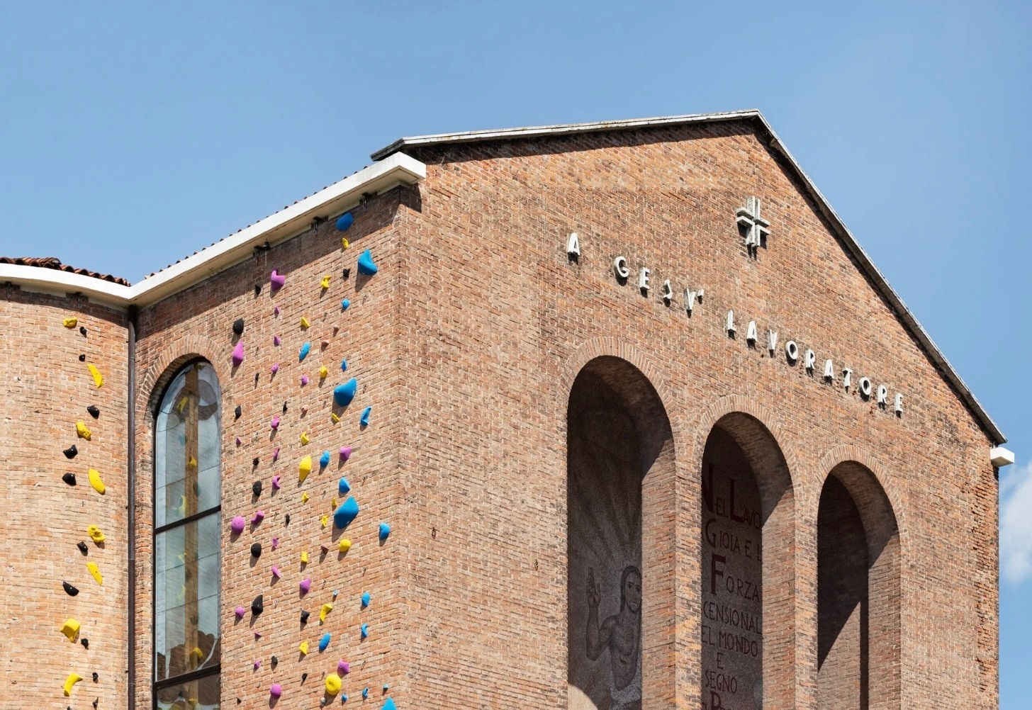 Concrete Jungle is one of the projects featured in “Spaziale”, the Italian Pavilion at the 2023 Venice Biennale, curated by Fosbury Architecture, and was conceived to strengthen the living connection with the Venetian mainland. Exploring the relationship between nature and artificiality in urban space, Parasite 2.0 and Elia Fornari (Brain Dead) transformed the exterior of the Church of Gesù Divino Lavoratore in Marghera into a climbing wall. For over twenty years, a local association and a multicultural community have gathered there to share the values of sport. The project renewed the climbing holds, introduced new routes, and provided equipment used during the church’s annual patronal event. Initially presented at the Biennale as an installation, this structure made of industrial concrete has since become a permanent facility for children, promoting climbing as a tool for urban regeneration.