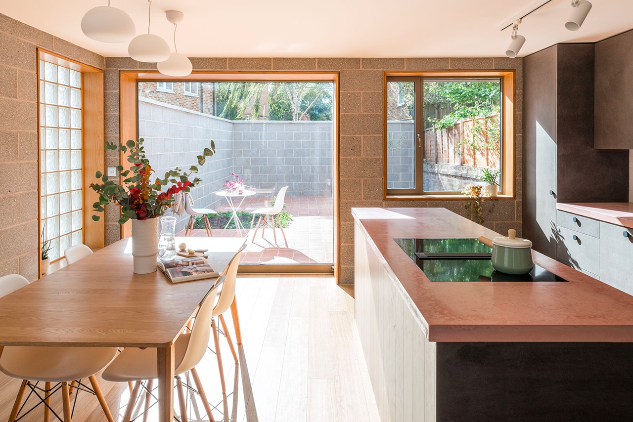 In Stoke Newington, North London, Nimtin studio designed the renovation and extension of a Victorian house, introducing a new unit in the rear garden and a double-height space in the centre of the house, radiating with light through the use of glass-brick. Durable and inexpensive materials, more often used in industrial than domestic contexts, dictate the straightforward yet welcoming character of the house: from the rear body wall in exposed grey concrete blocks, with a large sliding glass window opening the house to the garden, to the floors in European oak, terracotta tiles and pink concrete tops. Read more