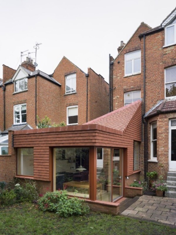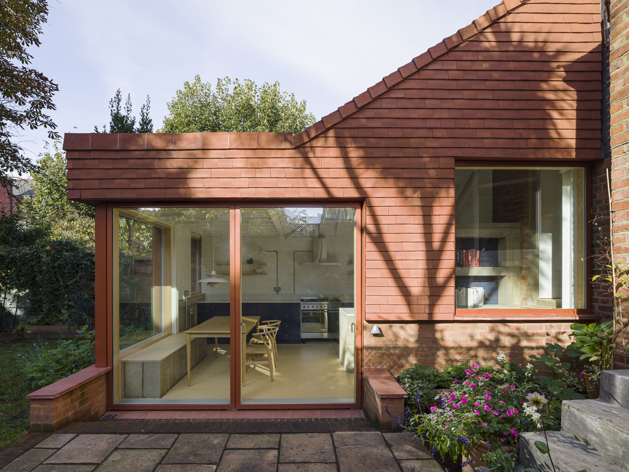 The appealing and “entangled” extension to the ground floor of a semi-detached Victorian house in Willesden Green, north-west London, recalls the memory of traditional ancillary buildings located in nineteenth-century gardens. The single-storey building is annexed to the rear of the existing building to accommodate a new kitchen and dining room, creating textural continuity with its surroundings through the terracotta cladding on both facades and roofs. In the interior, the simple and essential finishes of exposed concrete and ceramic tiles and wooden furnishings give the space a deliberately humble but warm and welcoming feel. Read more