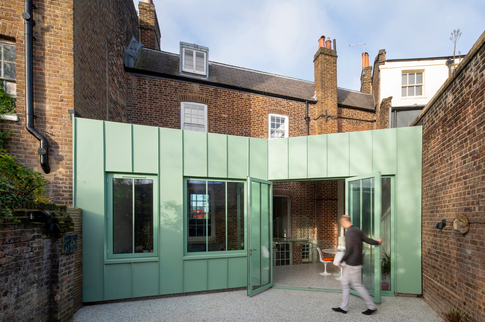 The extension of a Georgian house in south London, whose plan and elevation are dictated by strict planning restrictions, provides residents with a new space for conviviality and entertainment, as well as a second entrance to the house. Externally, the green steel cladding, whose vertical joints evoke the rhythm of the greenhouse pillars that originally stood at the back of the plot, contrasts vividly with the red bricks of the historic house. Internally, the airy and bright space, thanks to the light filtering through the large windows and playful circular skylights, is connected to the existing building via a diaphanous glass staircase. Read more