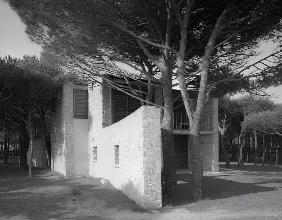 The first example is Casa Pineta 1 (House in the Pinewood 1), a bourgeois dwelling oriented towards the island of Montecristo, like the other typologies. He describes it as an island within an island, a “precious emotional element to whose loving embrace the whole plan is strained, distant or almost within reach, depending on the mutability of sky and sea.” This design principle is manifested in large windows with wooden frames facing Montecristo, supported by load-bearing walls made of native granite flakes.