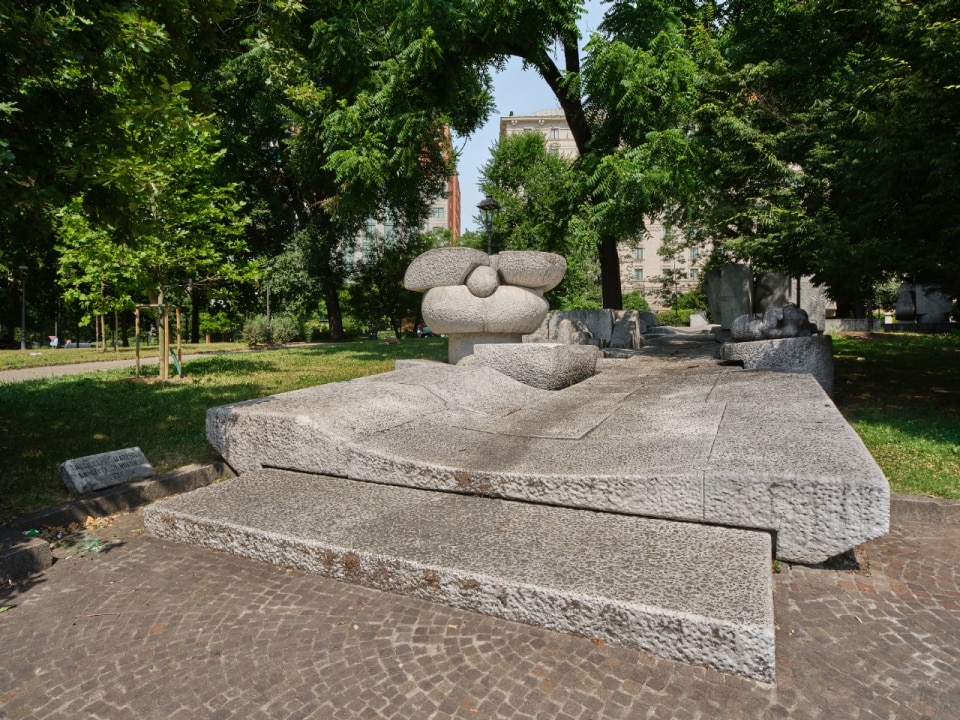 This “monument-path,” designed by Pietro Cascella with the urban layout by Vico Magistretti, is a 38-meter-long stone walkway composed of abstract carved blocks and figurative reliefs in bardiglio marble, culminating in a bronze statue of Giuseppe Mazzini standing before a chair — the first gesture of inhabiting.