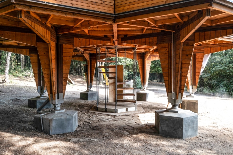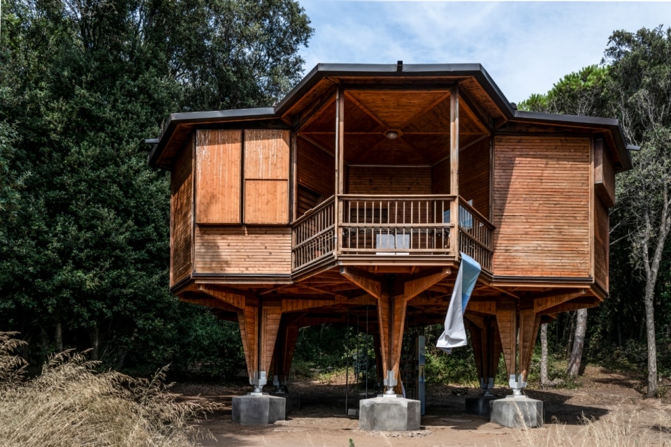 After several months in Rome, Giorgini returned to Florence: finally, a moment to experiment with material and structure. The result took shape in the floor plan of the Esagono House and in an aggregative system of prefabricated hexagonal wooden modules, raised on six conical, cruciform-section pillars that powerfully express structural tension.