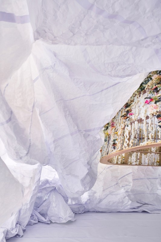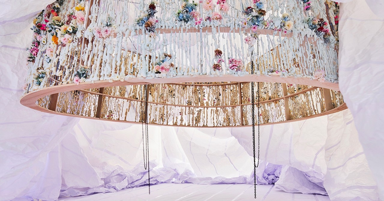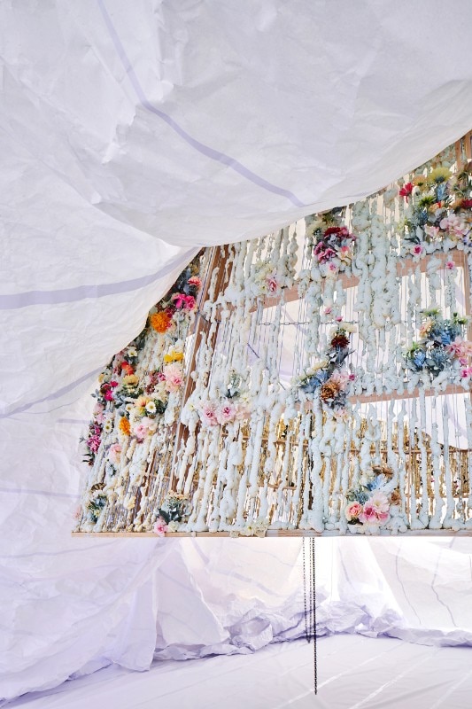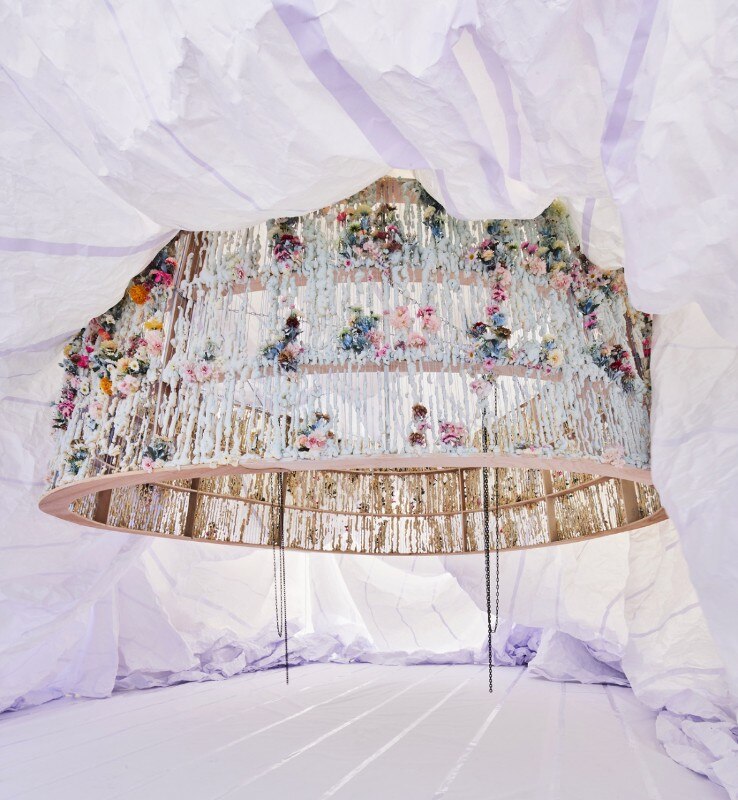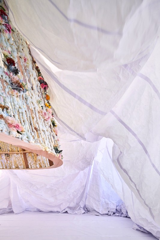 The space is completed by a circular candelabrum, which mixes wood, flowers and polyurethane foam.