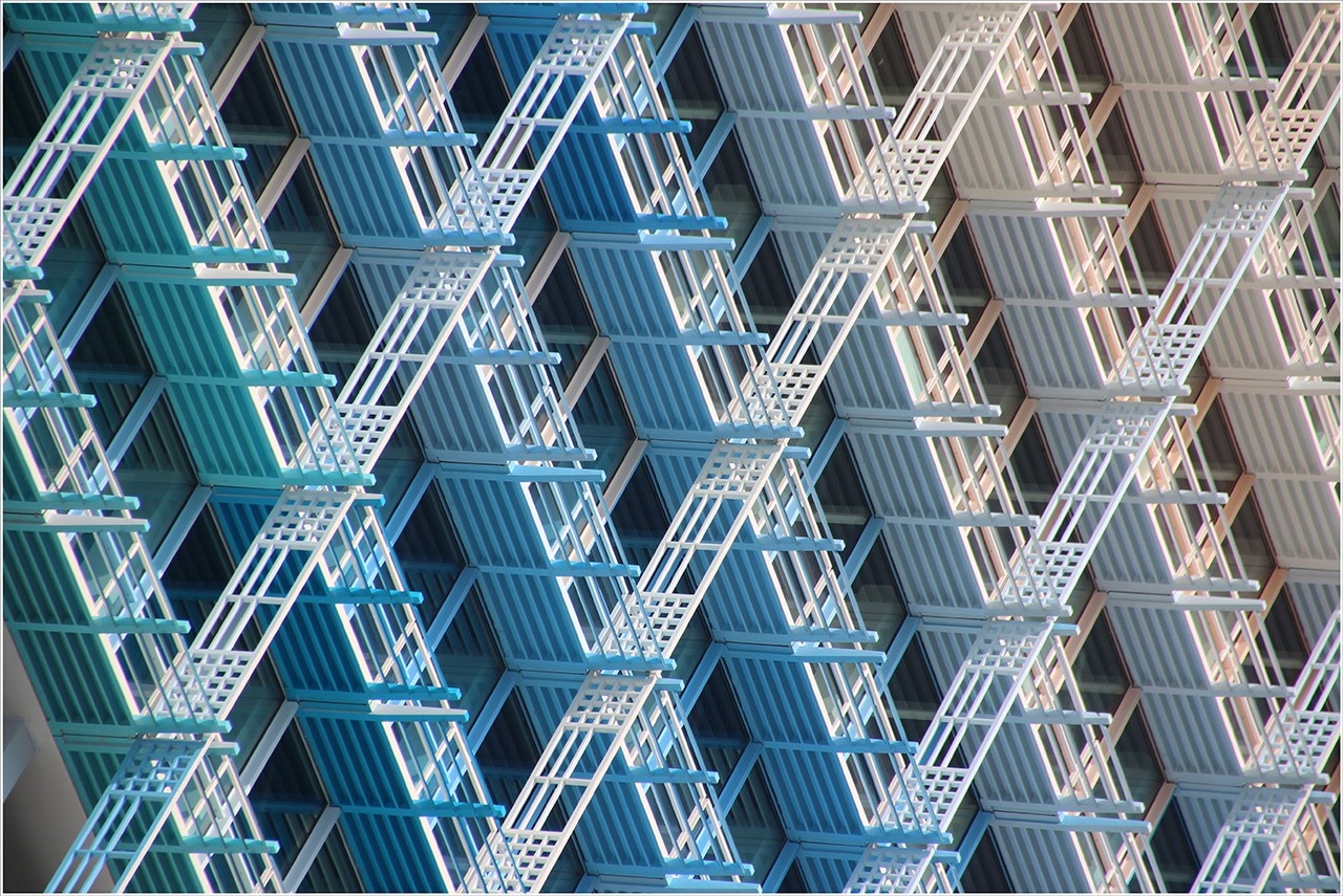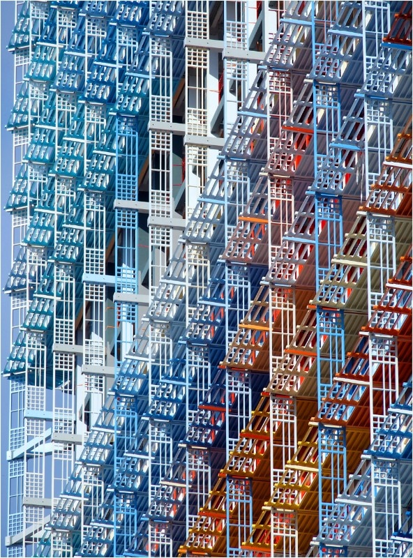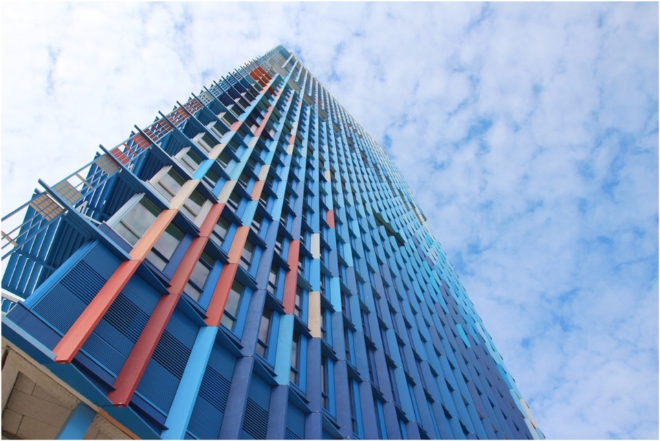 The building’s skin is made up of the balcony railings and vertical struts superimposed on the plane of the balustrades, enhancing the three-dimensionality and depth of the facade system.